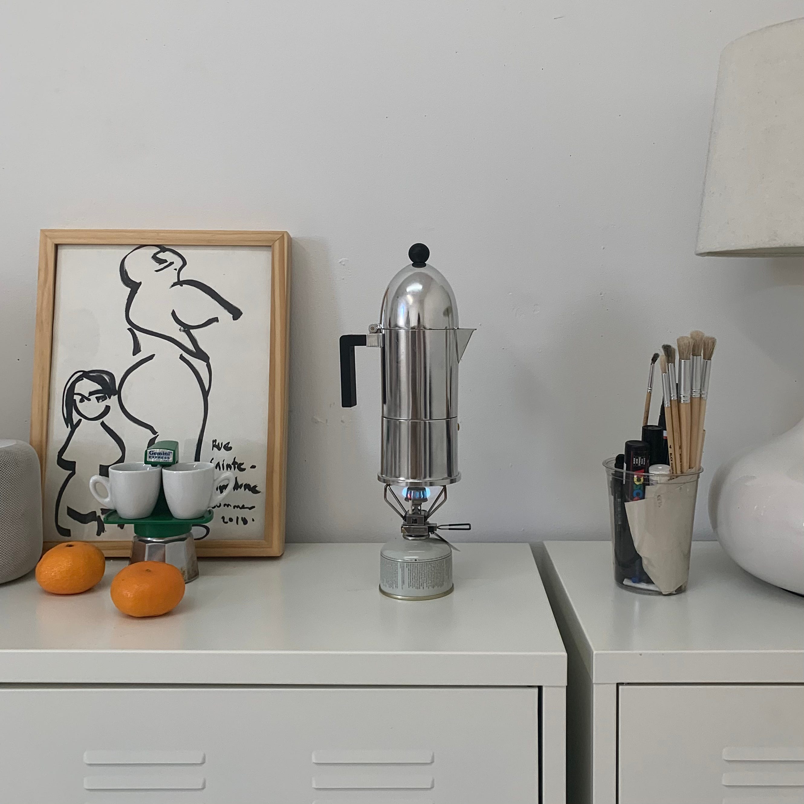 Like David Cazso’s work, his coffee ritual is multidisciplinary. I first admired his brew last Monday via Instagram Stories, where it featured an Alessi espresso maker with the word “LUNES” scrawled atop the photo. I’d later learn that in the context of his present exploration inspired by his native Mexico, Monday stands for calla lilies. On Tuesday, perched on a teeny burner were twin porcelain cups nestled into a Gemini Express double-espresso maker, featuring a heavy scribble reading “MARTES”—David’s Tuesday meditates on river stones.