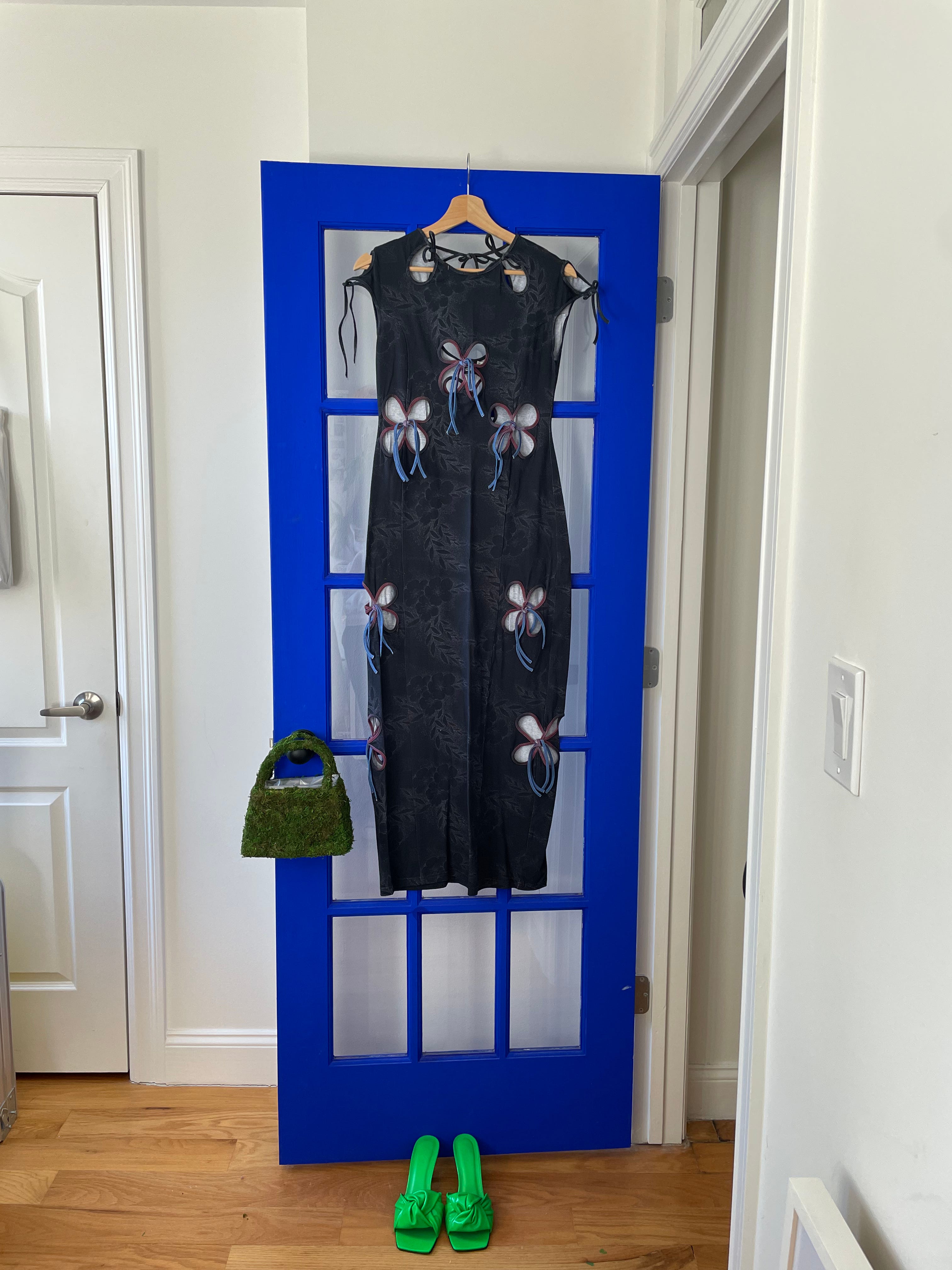 “I didn't actually need to go out to buy something new, I had a brand new J. Kim dress sitting in my closet from last summer bought from my favorite online store—Maimoun. I was supposed to wear this to a summer wedding but went with something different, SO, my lebāsé nō for Nowruz this year is NEW, even though technically ‘never worn.’ J. Kim exudes the meaning of Nowruz to me—that being ‘themes of home, family values, and search for a place of empowerment,’ and her intersectionality of identity as a person is incredibly relatable. I'm pairing the dress with a decor item I bought from Michaels while browsing for crafts for my 5-year-old. I'm using it as a purse, even though it's technically not a purse, but I saw it and it screamed Nowruz, so here we are. Shoes are by By Far in an electric green, because green is LIFE.”