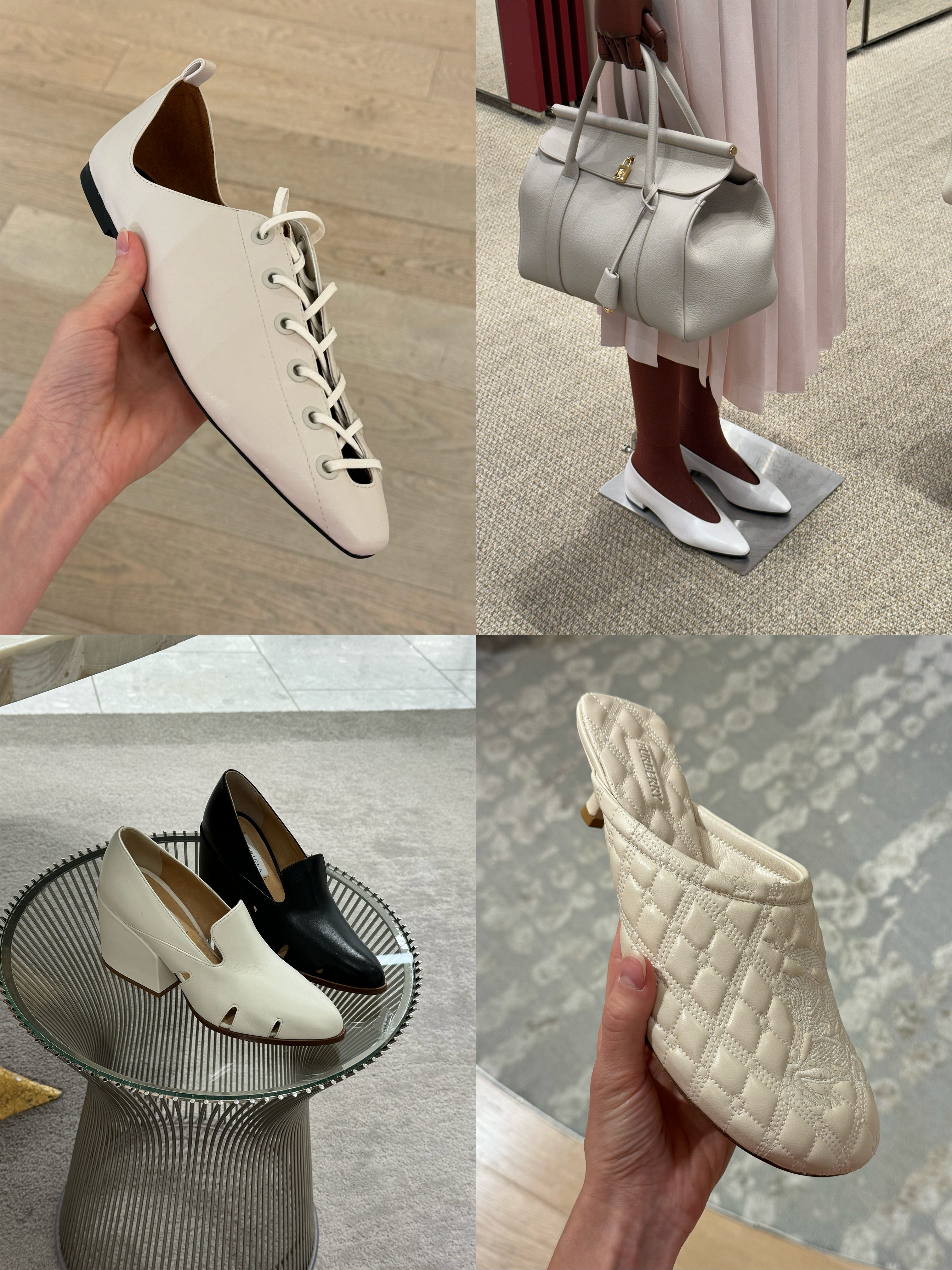 It’s very me to take pictures of all the shoes that trigger a strong buy impulse, only to look back and realize they’re all white, almond-toed, and featuring varying degrees of a micro-heel. But! Each with a totally unique aura, of course. Stella McCartney’s derby-like lace-up flats; Loro Piana’s Rebeccas back for another season at the forefront of my desire; Gabriela Hearst’s cheeky, Philo-era Céline-like pumps; and most surprising to me of all, these Burberry mules with textured leather in the style of a 1950s quilted bathrobe.