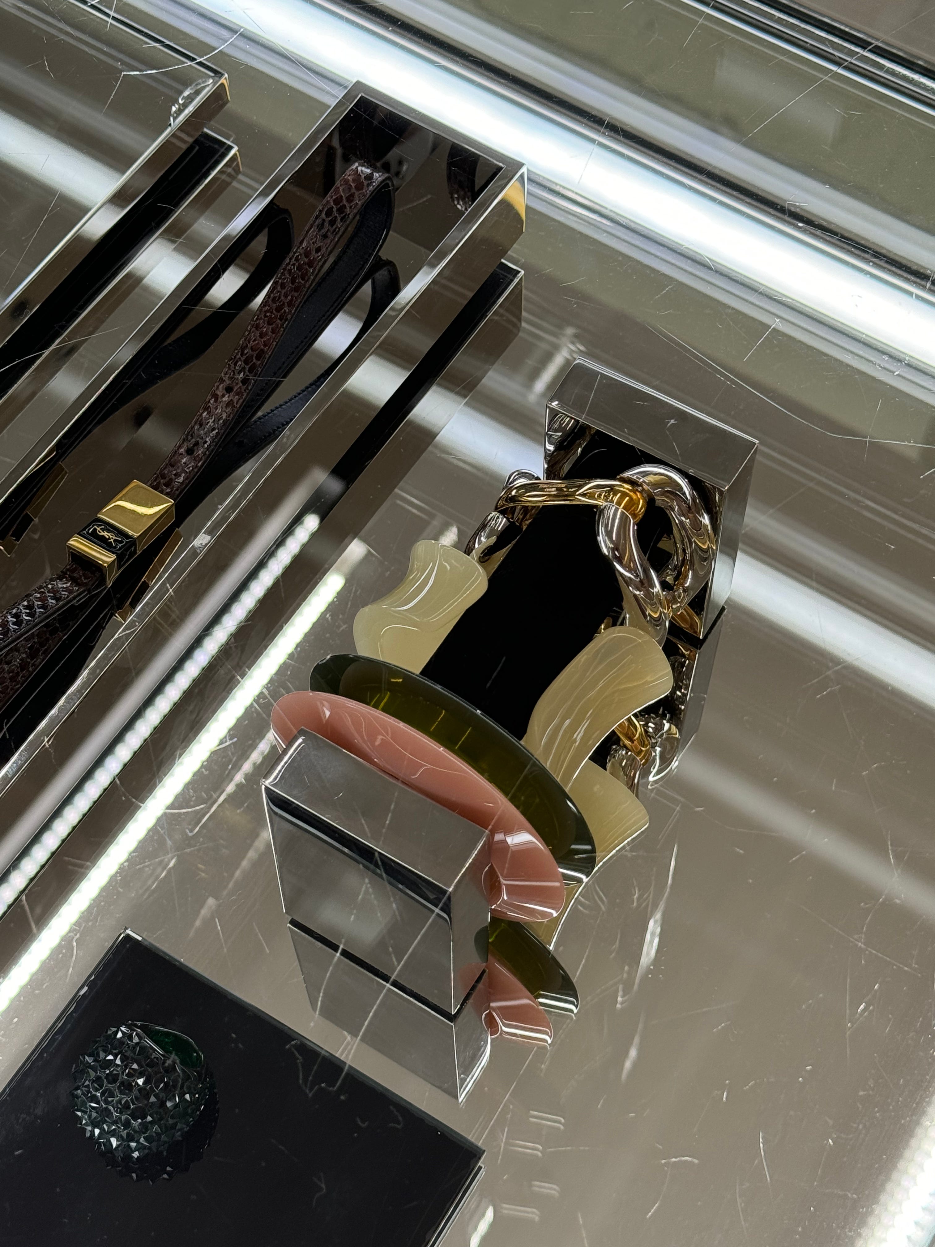 I’ve had a lot to say about Saint Laurent lately—on the subject of the brand finding its stride in bold, clean sexiness—and its pitch for jewelry meshes nicely with this exciting turn: The resin bangle hath risen!! These jelly-like ones from the brand that I spotted in store are so new, they haven’t even made it to Saks’ site yet—YSL’s two tortoiseshell versions and a pair of earrings have though, as has this 3-for-1 from Tory Burch and a ring from Maria Black. The gold-versus-silver war has raged far too long, I’m ready to exit the false dilemma in favor of a little soft-pop adornment.