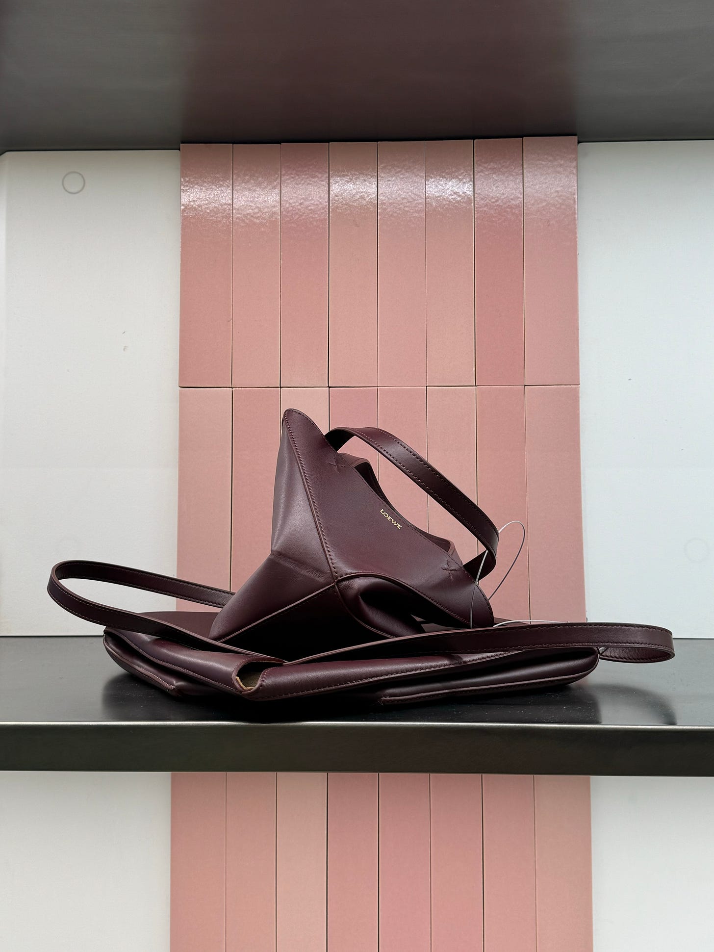 I surprised myself by how taken I was with all the teeny bag options—they felt fresh in a way a baby bag hasn’t since the dawn of Le Chiquito. This particular styling at Loewe’s section, featuring a Mini Puzzle Fold Bag as though it’s hatching out of the slightly larger Puzzle Tote, is twisted and kind of sweet in a uniquely J.W. Anderson way.