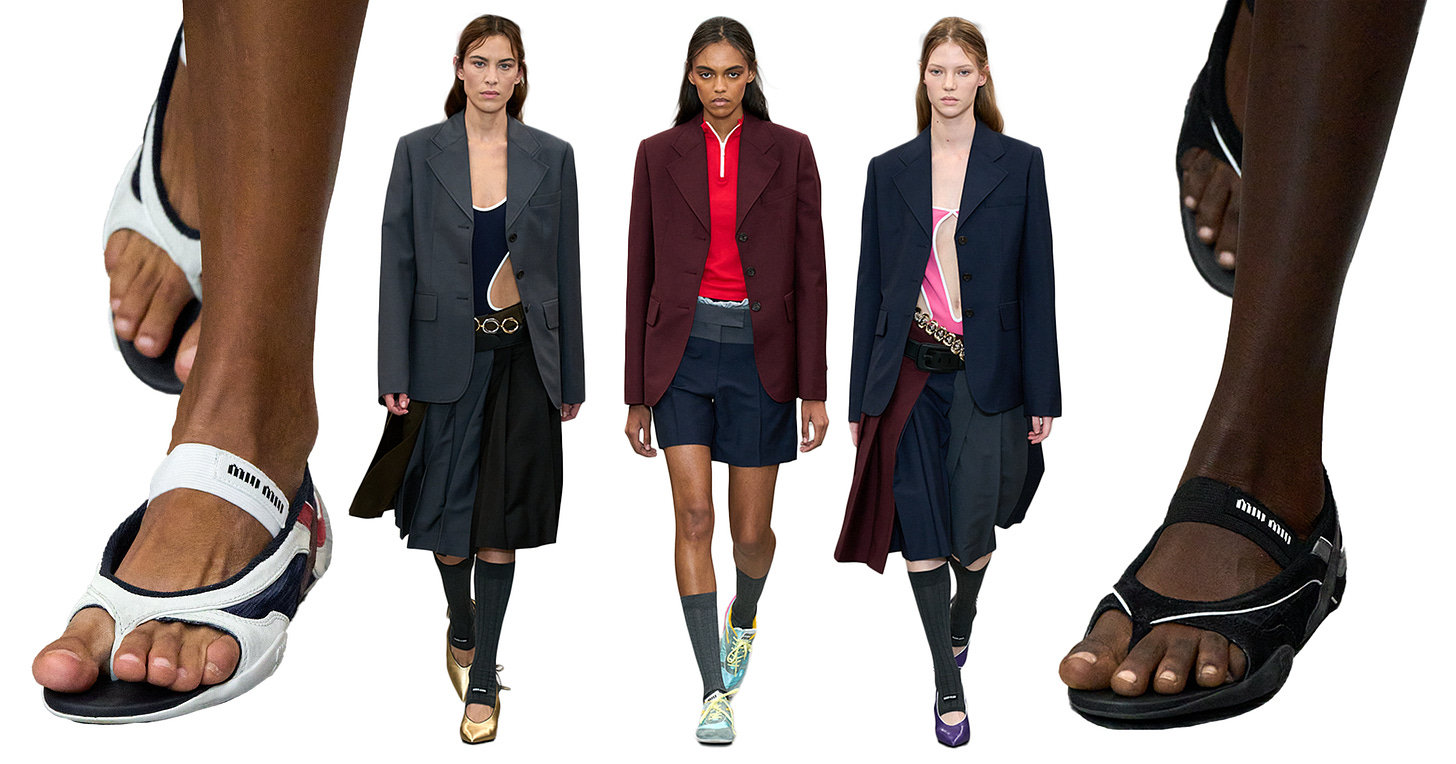 Also tempting: There is always a Miu Shiu (despite my gripes about the leather), and I’m rooting for the stretch thong sandal. The spirit of the brand is seen best here, even if I’m feeling a bit eeky about it at the moment.