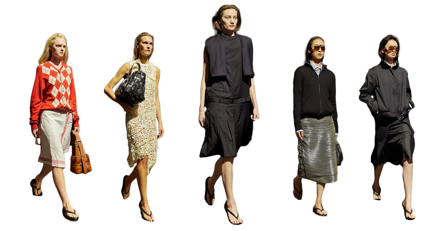 Let me go a step further and say it’s time for the Prada group to do something about its stiff leather shoes, which are at odds with the state of our attractions—it’s where Prada went wrong with its interpretation of the Margaux, in thinking it was a set of buckles or curved lines that made the bag, when actually it was its perfect floppiness. Paper-thin and melty-soft leathers at Martiniano and The Row are like the imperfection-embracing natural wine of the moment, while Prada and Miu Miu’s thick, ankle-breaking patent leather is like Robert Parker’s dated Bordeaux. If a fashion show is just a vehicle for selling accessories, sell me some accessories!