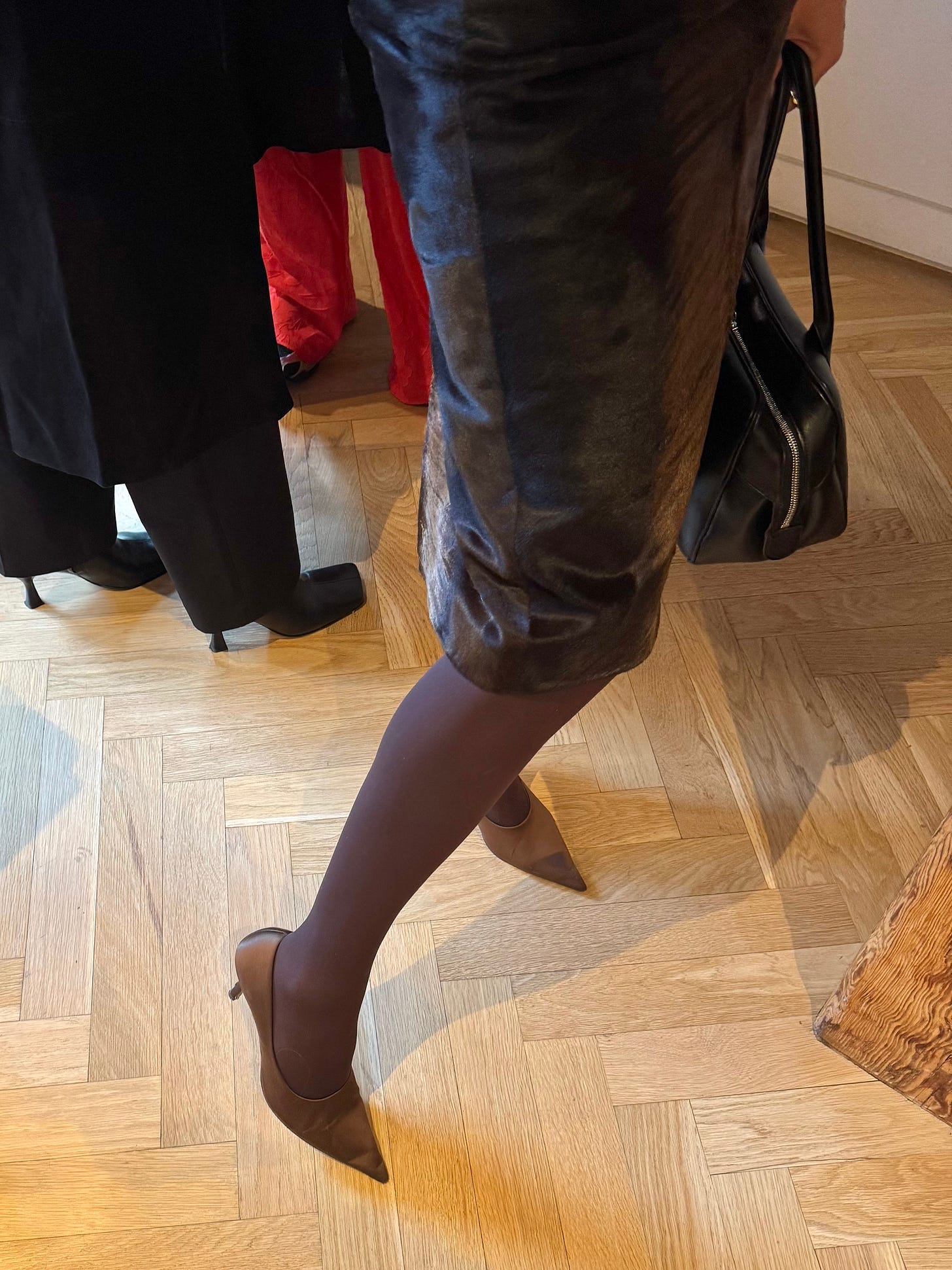 Ran into the stylist Elly McGaw at Maria’s salon and while we were, as a little group, admiring her outfit of mostly Magda Butrym pieces (including this pony hair skirt), we considered her great tights. Not quite brown, not quite purple. The pair, made by revival brand L’Eggs (Cami Telez’s latest undertaking), appeared to abide by a rule my uncle has for suits: never wear one in a color that can be described in one word.