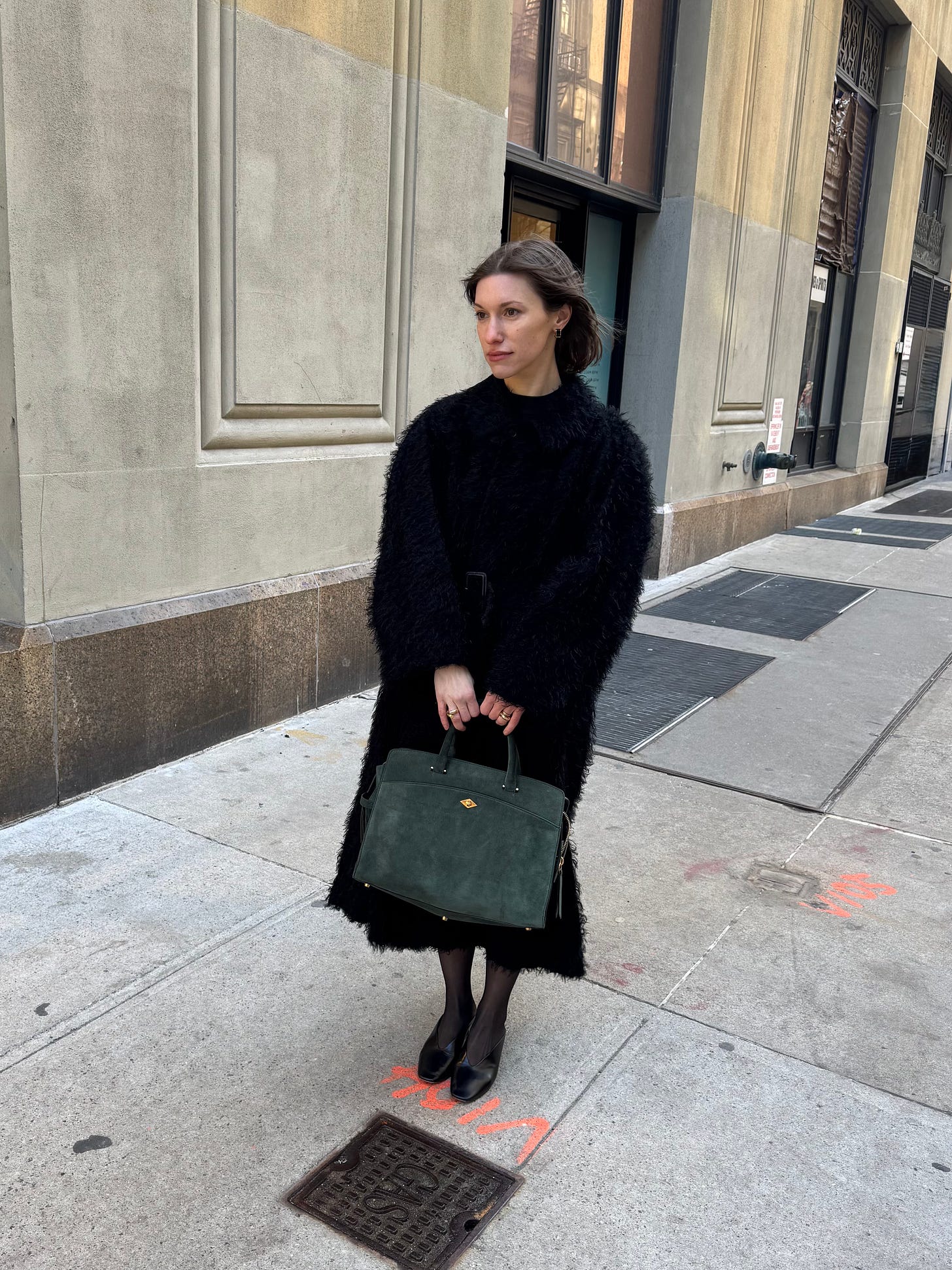 Carven Belted Faux-Shearling Coat, $3,850 / Métier Private Eye Suede Tote, $4,150 / Fforme Long Sleeve Top (similar, $645) / Le Monde Beryl Regency Leather Wedge Mule, $349 $495 / Toteme Gold-Tone and Enamel Hoop Earrings, $490