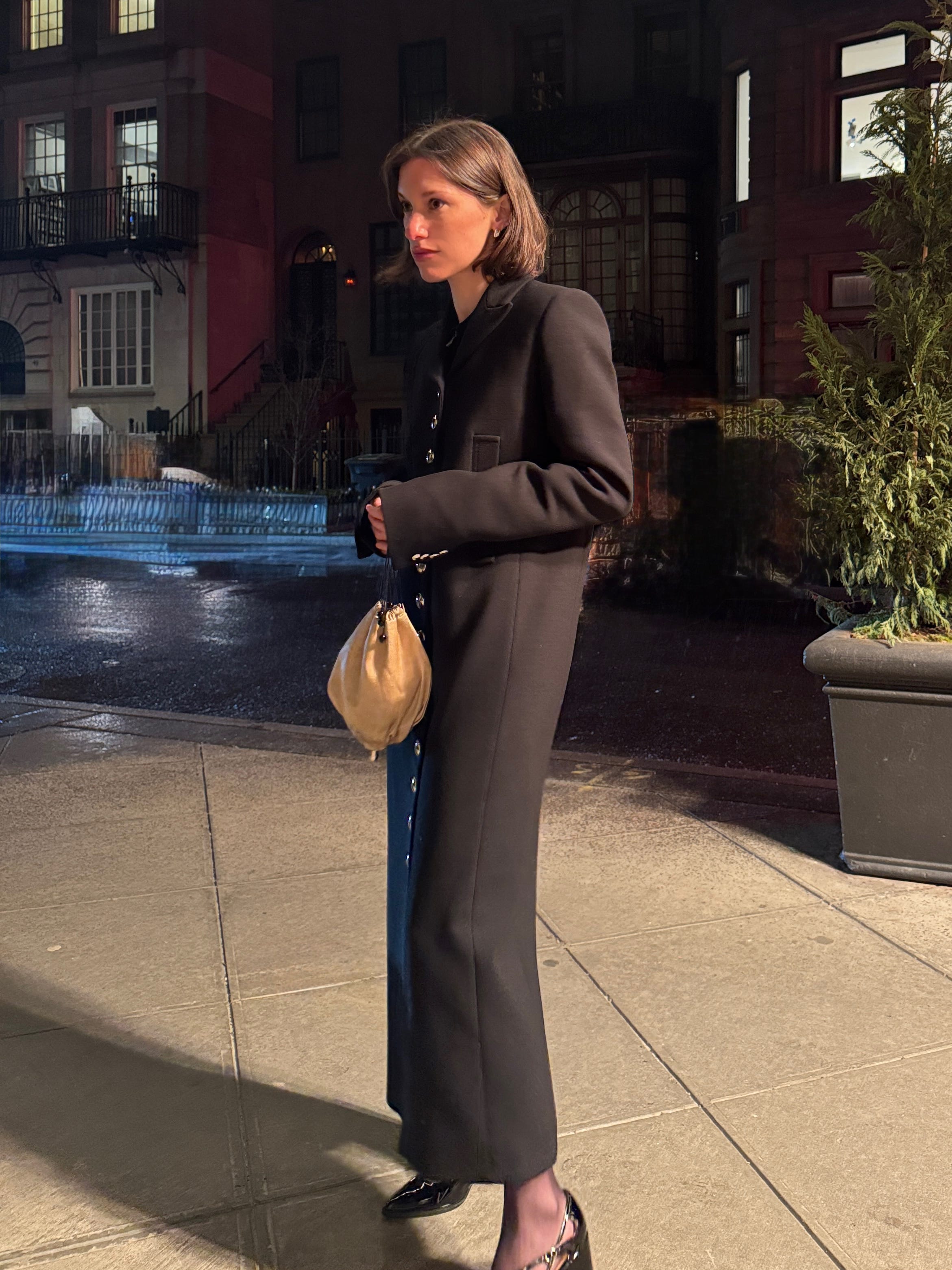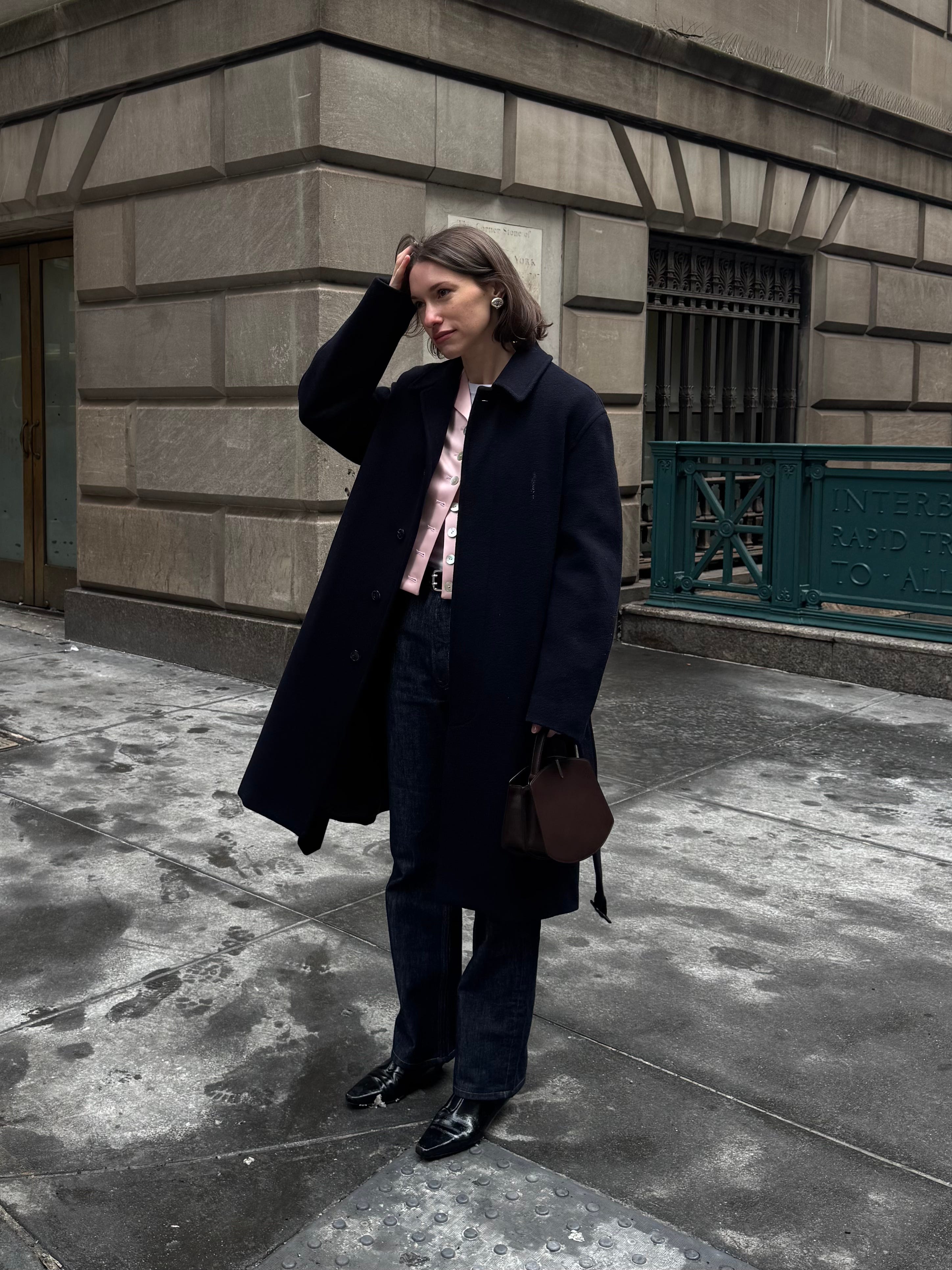 Auralee Brushed Coat, $988 $1,975 (in black here) / Sandy Liang Charm Satin Crop Jacket, $595 / Enza Costa Textured Rib Long Sleeve Crewneck Top, $165 / Auralee Indigo Hard Twist Denim 5P Jeans, $450 / Dehanche Mini Hutch Silver Belt, $190 / Savette Florence 20 in Coffee Leather, $1,750 / Toteme The Slim Leather Knee-High Boots, $791 $1,130 / Sandy Liang Earrings (similar from Camille Surault, $250)