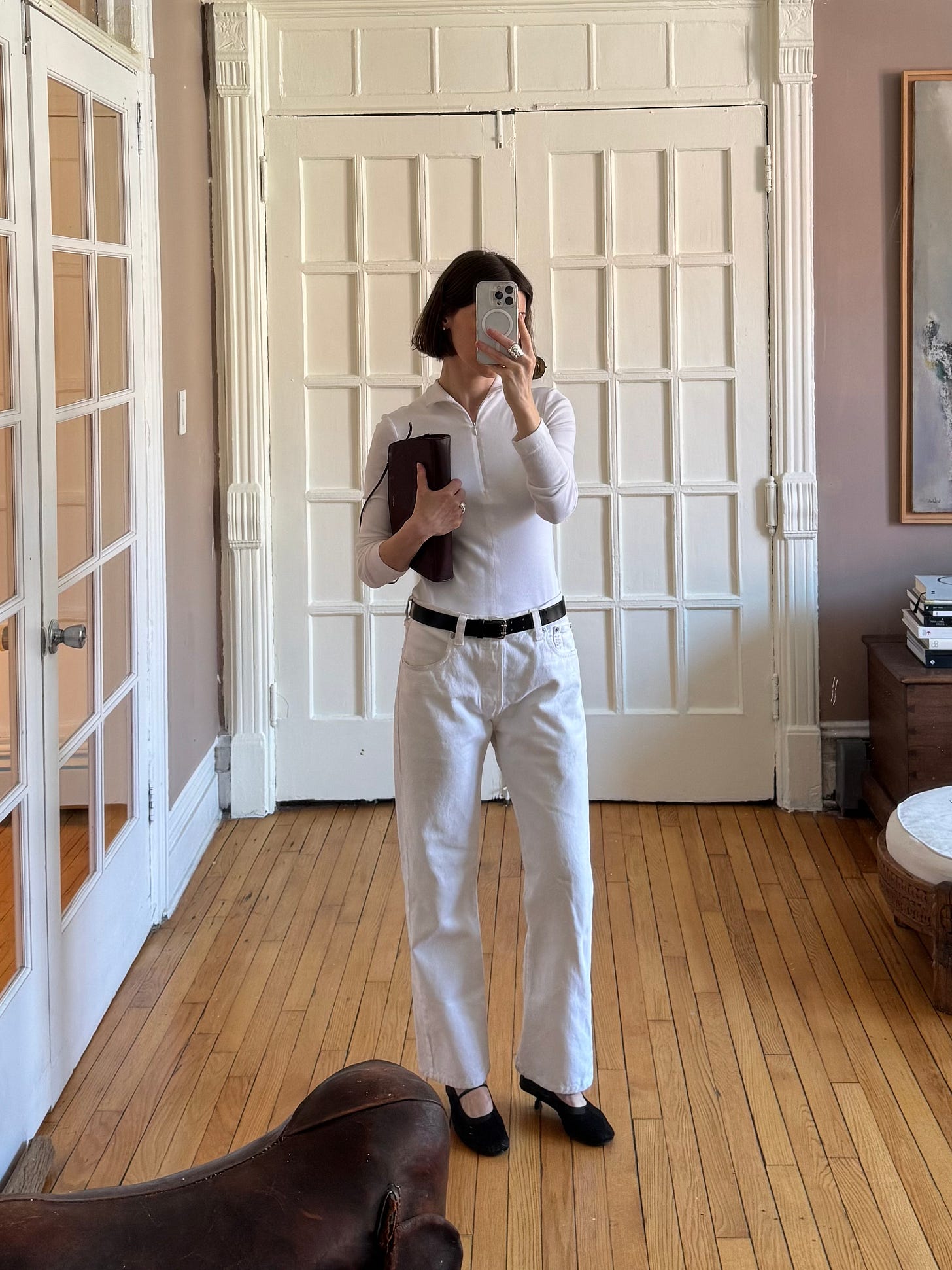 Rosetta Getty Zip-Up High-Neck Cardigan, $495 / vintage Levi’s 501s / Déhanche Mini Hutch Silver Belt, $190 / The Row Dalia Bag (on resale, $2,091) / The Row Kitten Ballet Pumps in Black Satin (on resale, $384)