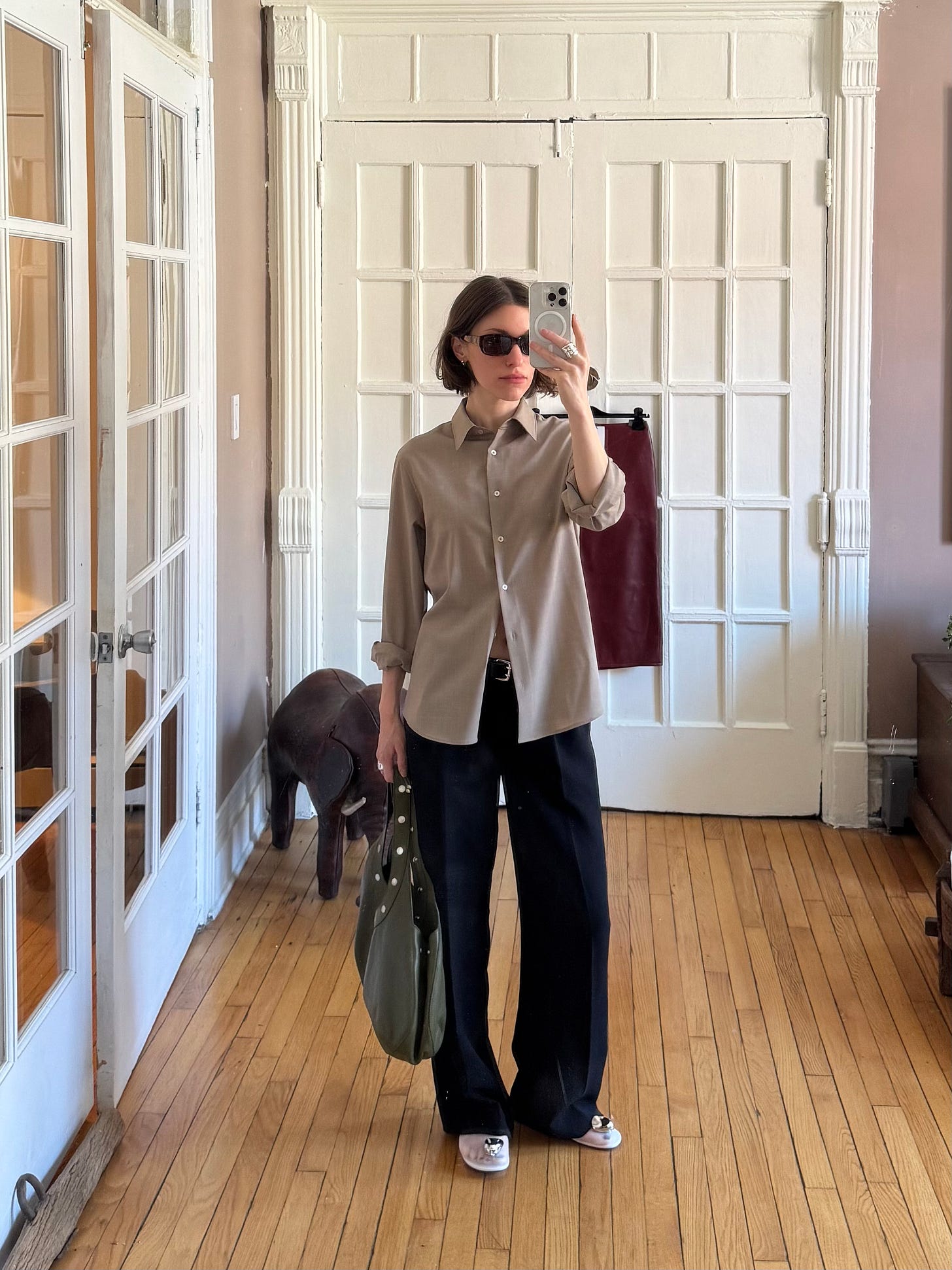 LFM Tropical Wool Shirt (similar, $198) / Aritzia The Effortless Pant Lo-Rise, $148 / Eckhaus Latta The Snap Bag, $675 / Tory Burch Patmos Mesh Flat, $278 / Déhanche Mini Hutch Silver Belt, $190 / Toteme Regular Sunglasses Havana, $350 / Completeworks R2227 Ring, $410