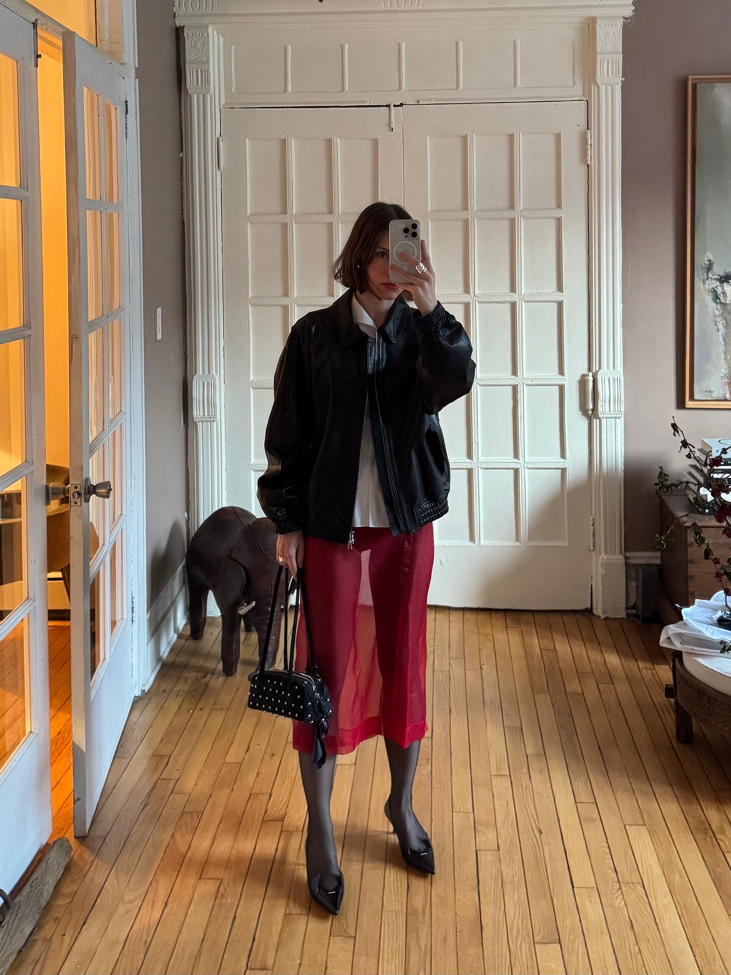 LFM Leather Jacket (similar from Proenza Schouler, $1,595) / Flore Flore Rosie Shirt, $415 / Maria McManus Lined Sheer Skirt in Carmine Red, $590 / Alaïa Studded Le Teckel Bag, $3,100 / Prada Two-Tone Pumps, $1,450