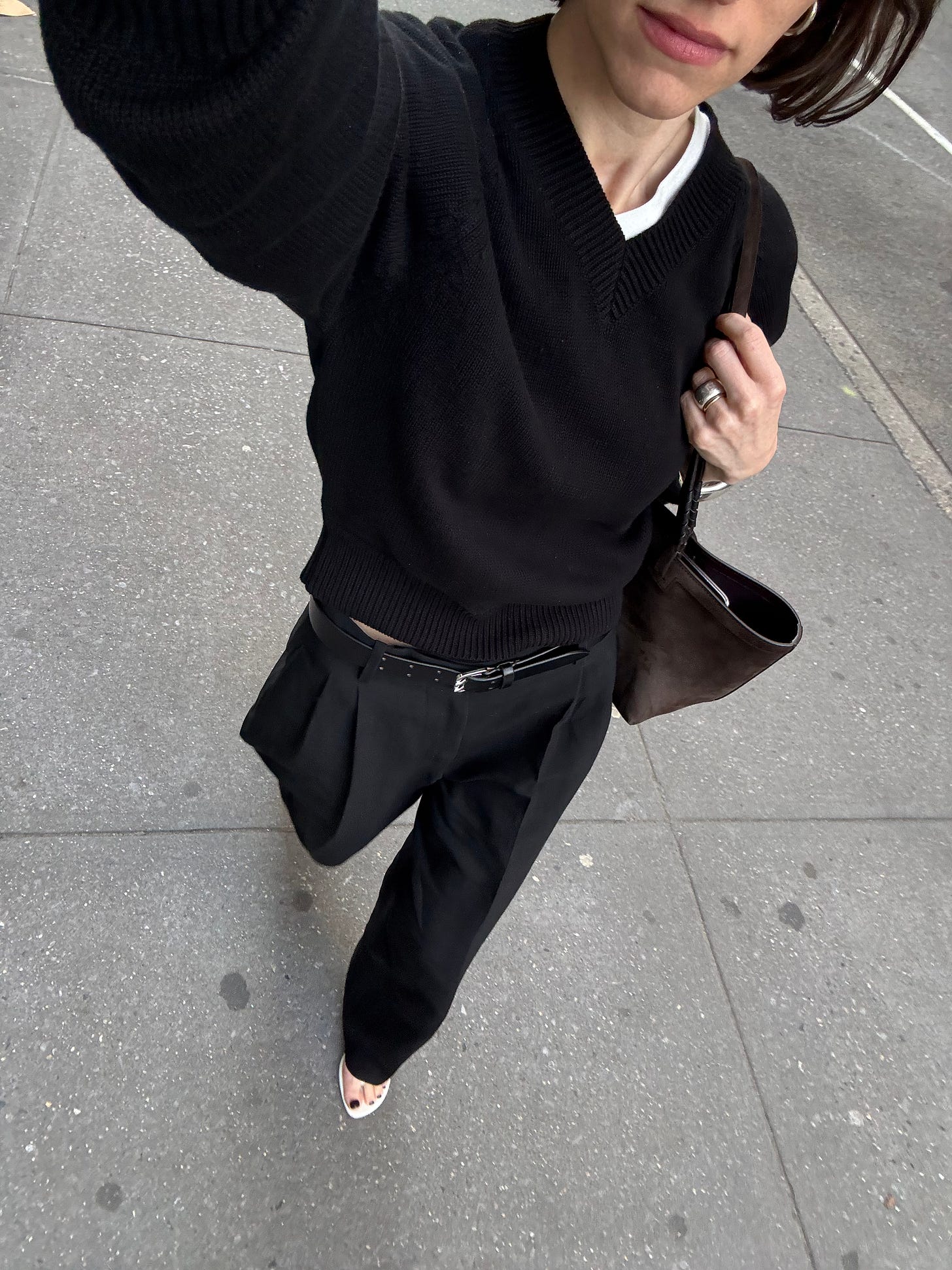 High Sport Black Veronica Sweater, $640 / A Yoon Jasper V Tee, $80 / The Row Lilas Pants, $1,450 / Déhanche Mini Hutch Silver Belt, $190 / Christian Louboutin Raratonga 55 Leather Mules, $795 / Métier Cala 32, $2,450 / Lara Somnez Nay Ring, $588