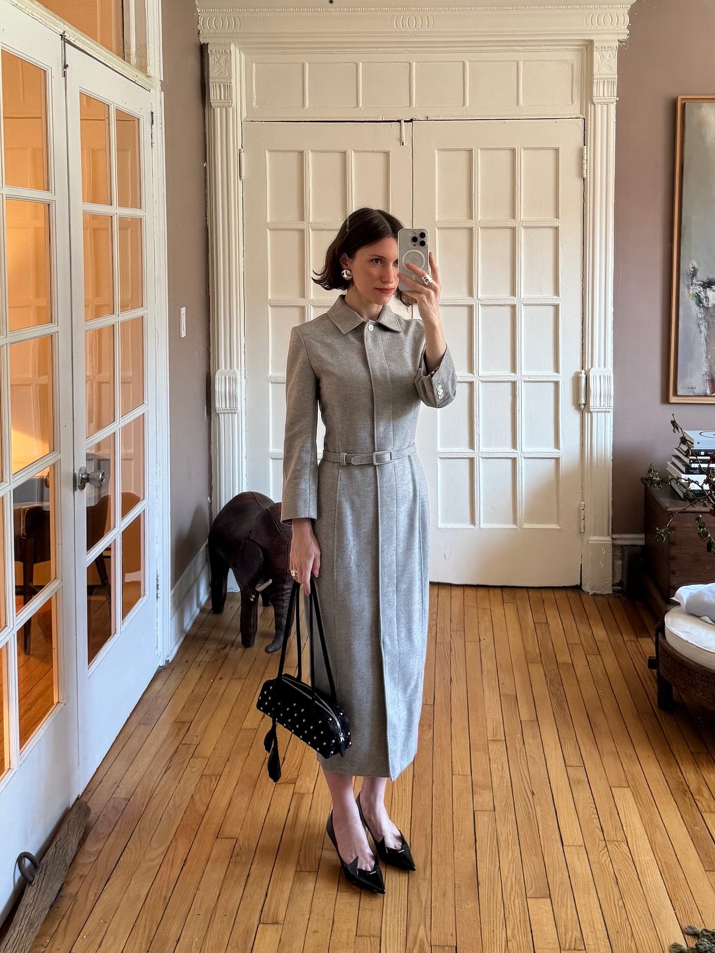 Thom Browne Wool Shirt Dress, $1,400 $2,850 / Alaïa Studded Le Teckel Bag, $3,100 / Prada Two-Tone Pumps, $1,450 / Nina Runsdorf Dome Earring with Brown Topaz Emerald Cuts, $650