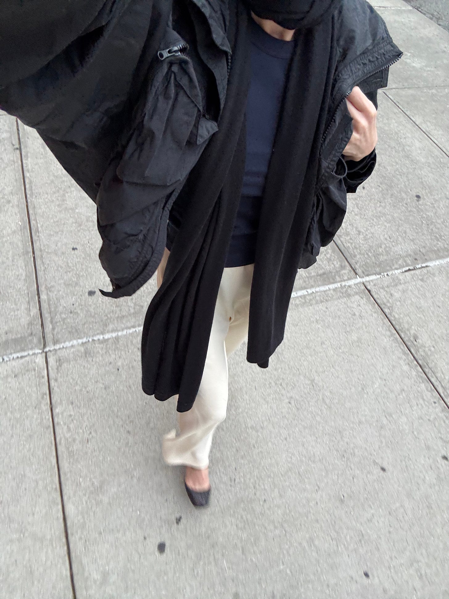 Connor McKnight Gill Back Wading Jacket, $1,200 / Flore Flore Navy Hannah Tank Top, $105 / The Row Gala Double-Cady Pants, $1,090 / Lemaire Micro Ballerina 85 Leather Sandals, $790 / Co Oversized Fine Cashmere Scarf, $395