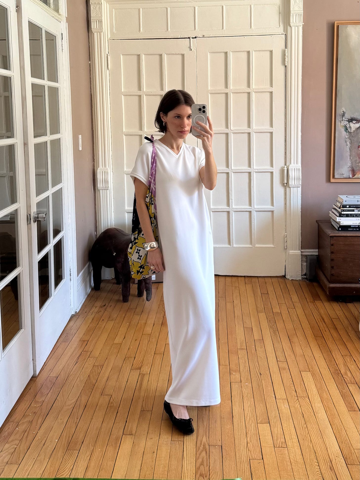 Khaite Verda Jersey Maxi Dress, $880 / Paid Actor Scarf Bag, $295 / Hai Harmony Ballerinas in Black, $105 / Vieux Wave Sterling Silver Bangle, $600 / Lara Somnez Nay Ring, $588