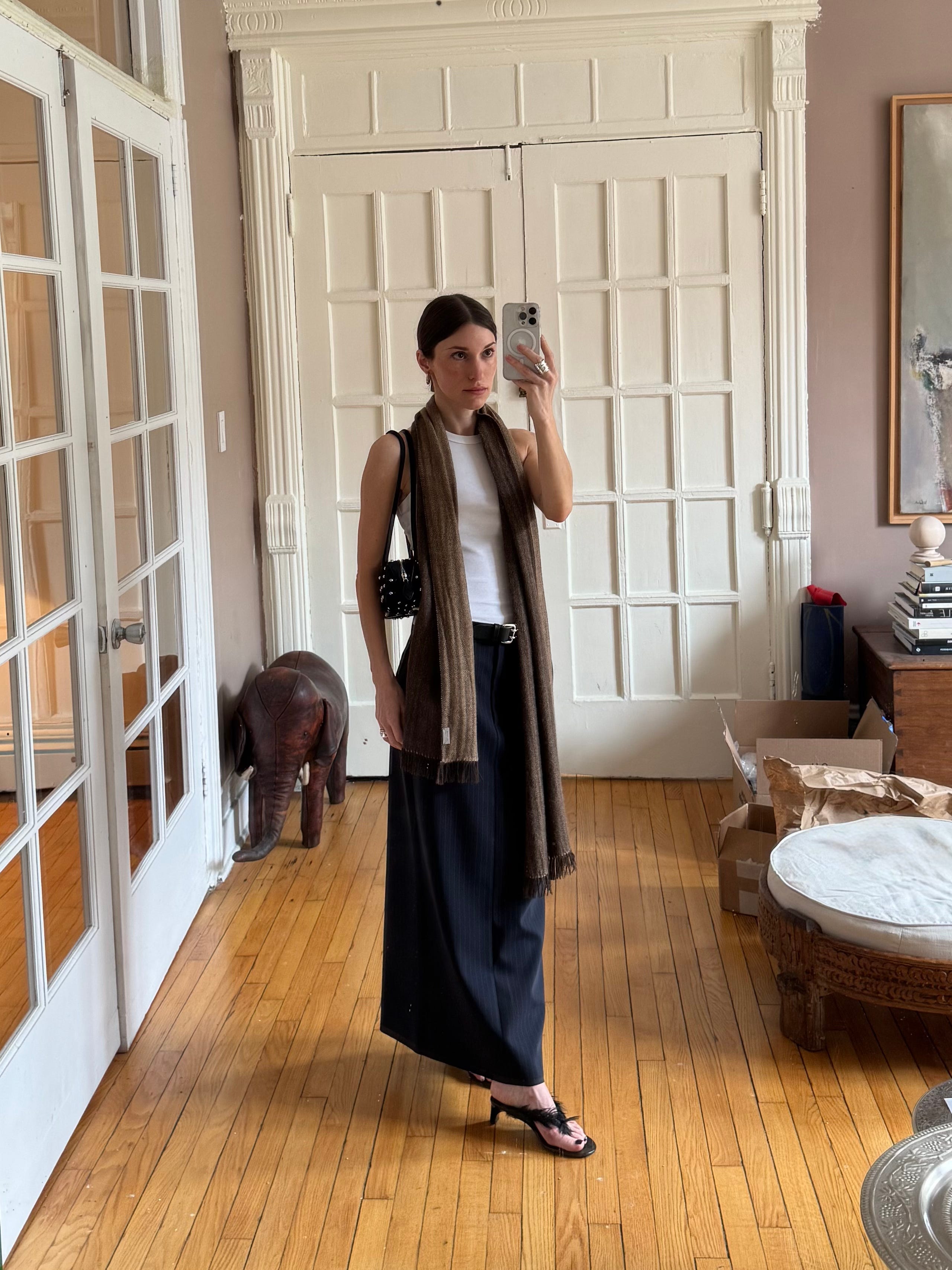 Flore Flore White Hannah Tank Top, $105 / Tibi Dominic Pinstripe Long Trouser Skirt, $525 / Norlha Prince Twill Two-Tone Scarf, $200 / Alaïa Studded Le Teckel Bag, $3,100 / Déhanche Mini Hutch Silver Belt, $190 / Tom Ford-era Gucci Feather Thong Heels via