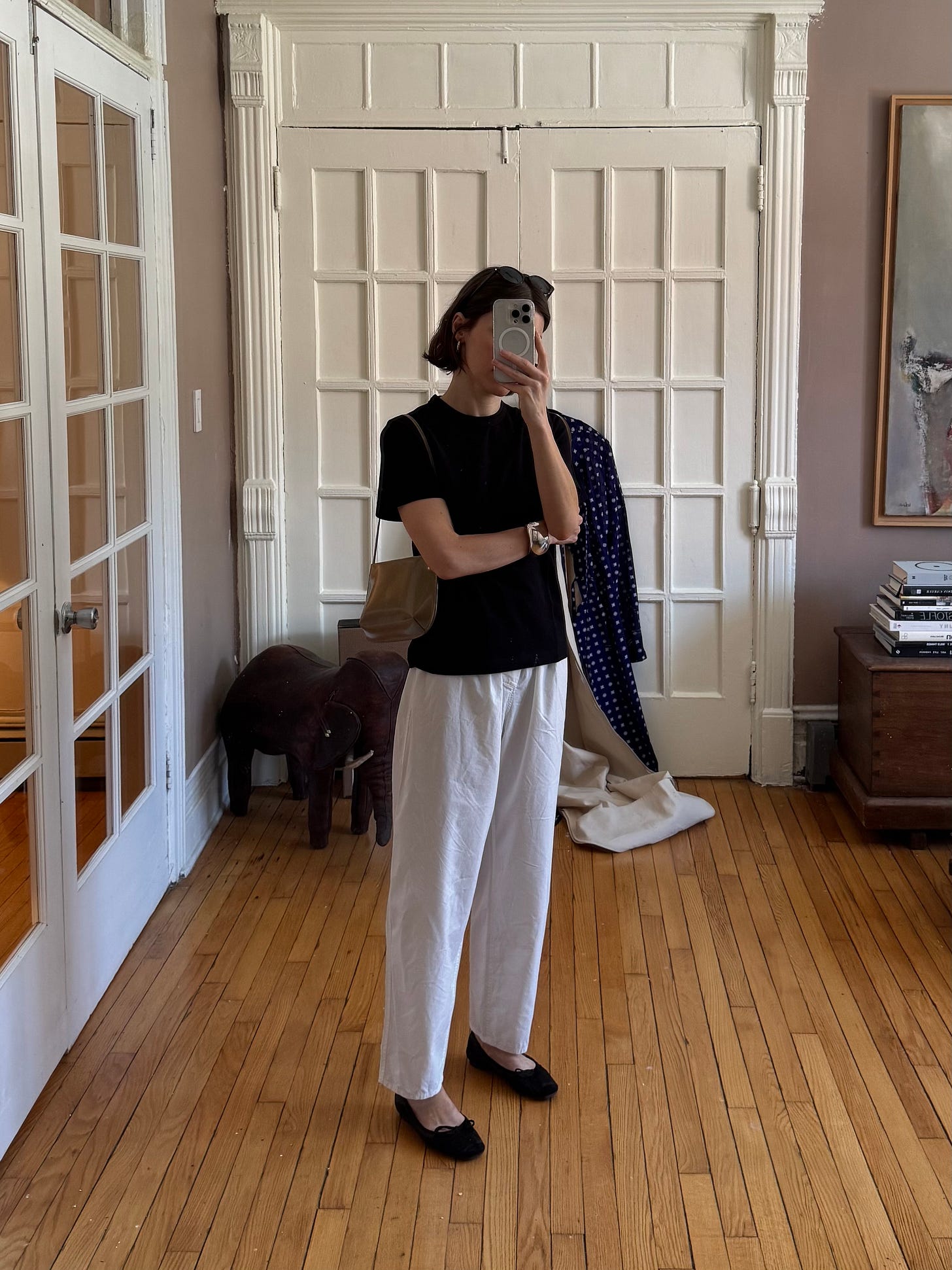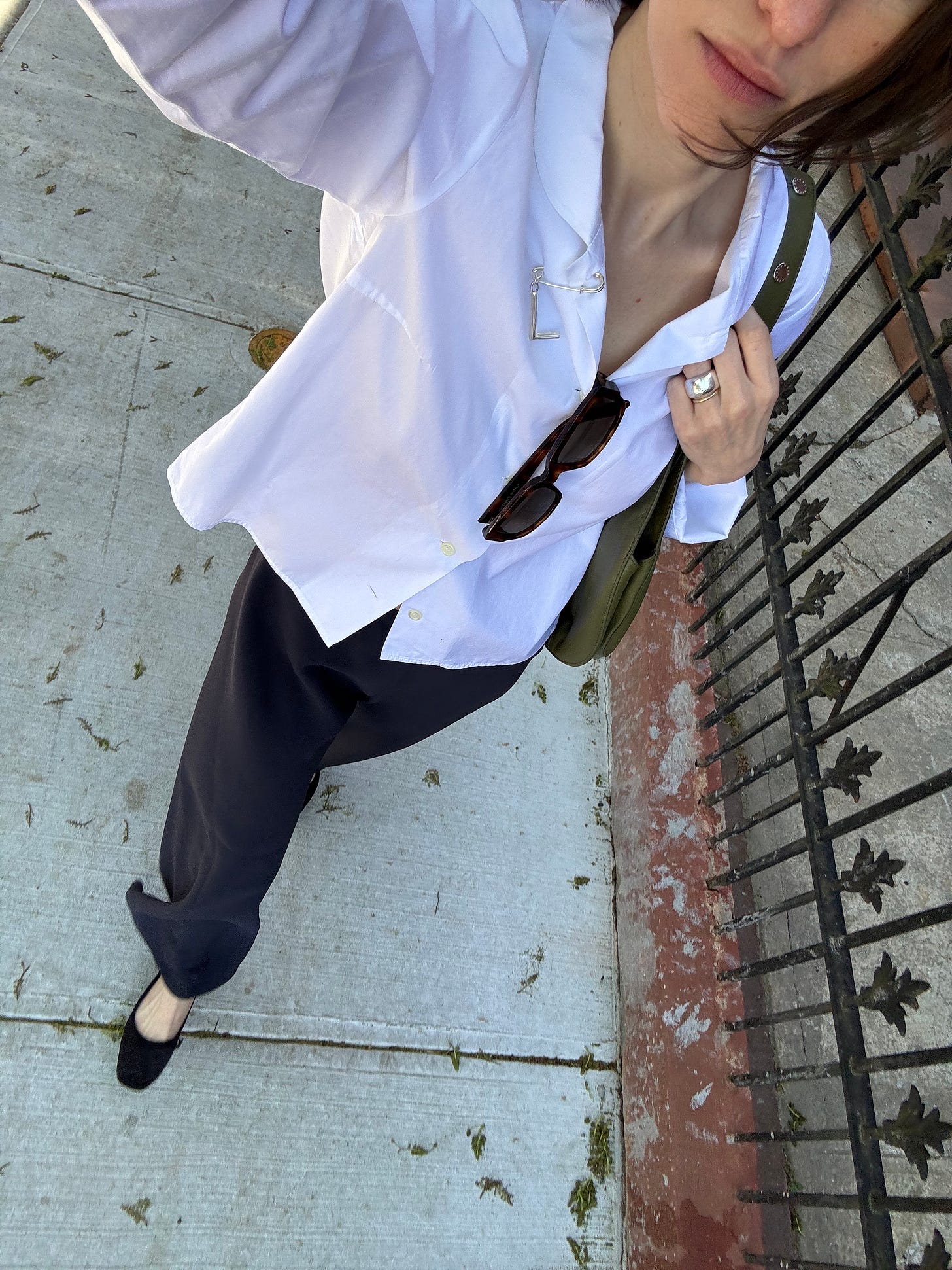 Agnes B. Peter Pan Collar Shirt (similar from Sandy Liang, $350) / The Row Gala Cady Pants, $1,090 / Hai Harmony Ballerinas in Black, $105 / Eckhaus Latta The Snap Bag, $675 / Toteme Regular Sunglasses Havana, $350 / Studio Dévé Alphabet Brooch, $250 / Lara Somnez Nay Ring, $588