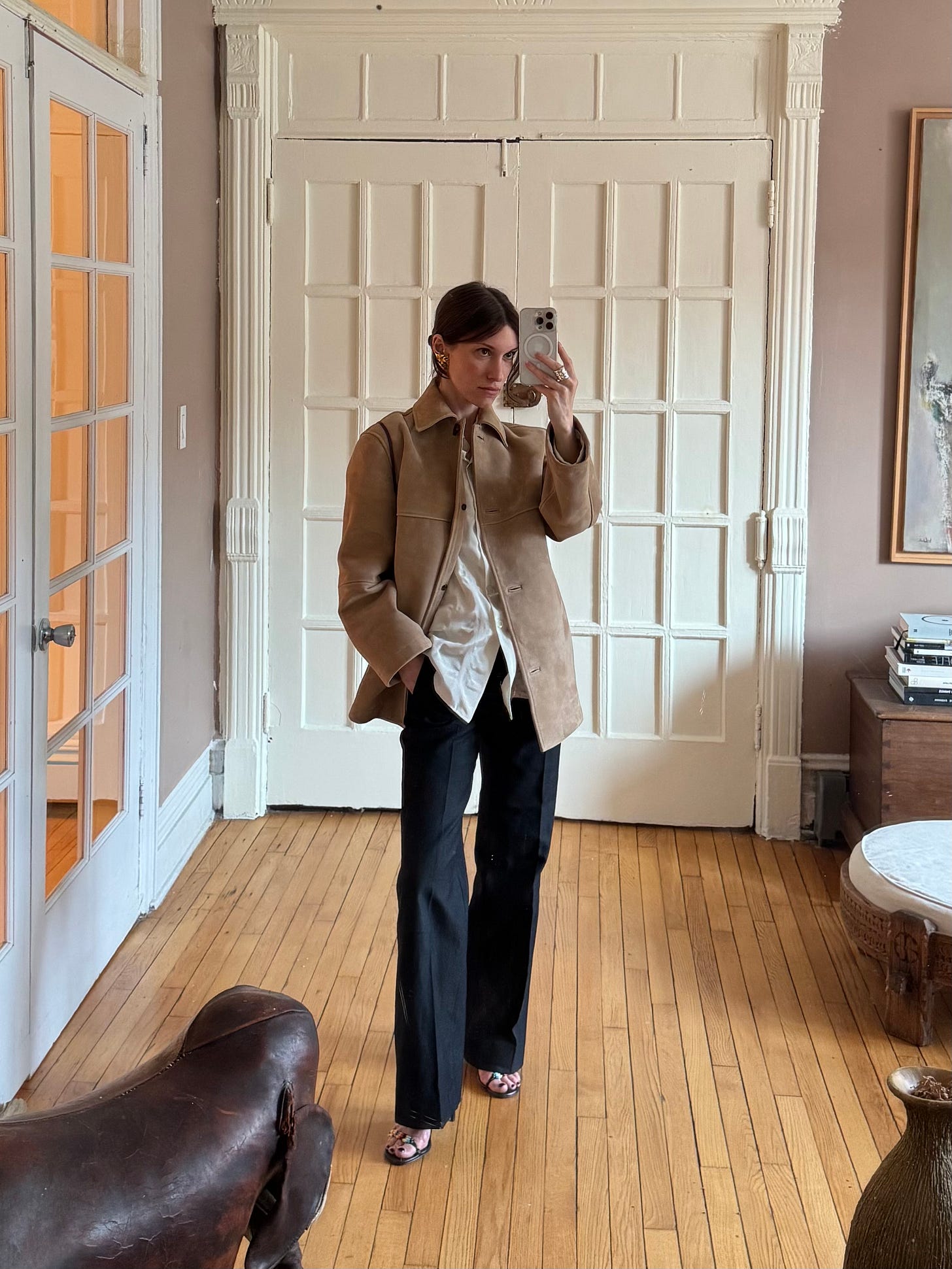 COS Collared Suede Jacket, $690 / Elizabeth Shevelev Anti-Perfect Blouse, $850 / Our Legacy Hip Trouser, $350 / Khaite Loop 35 Beaded Leather Sandals, $960