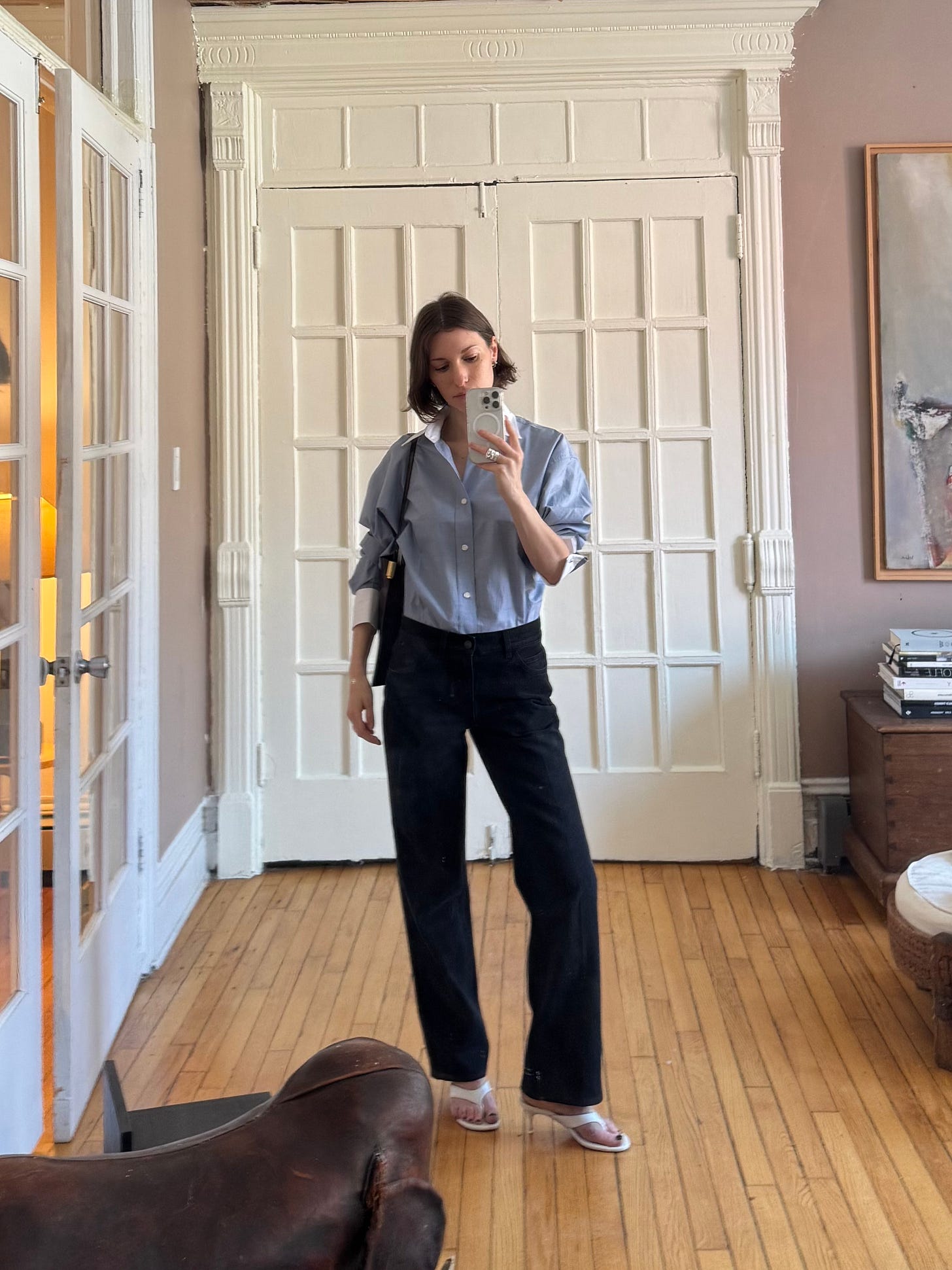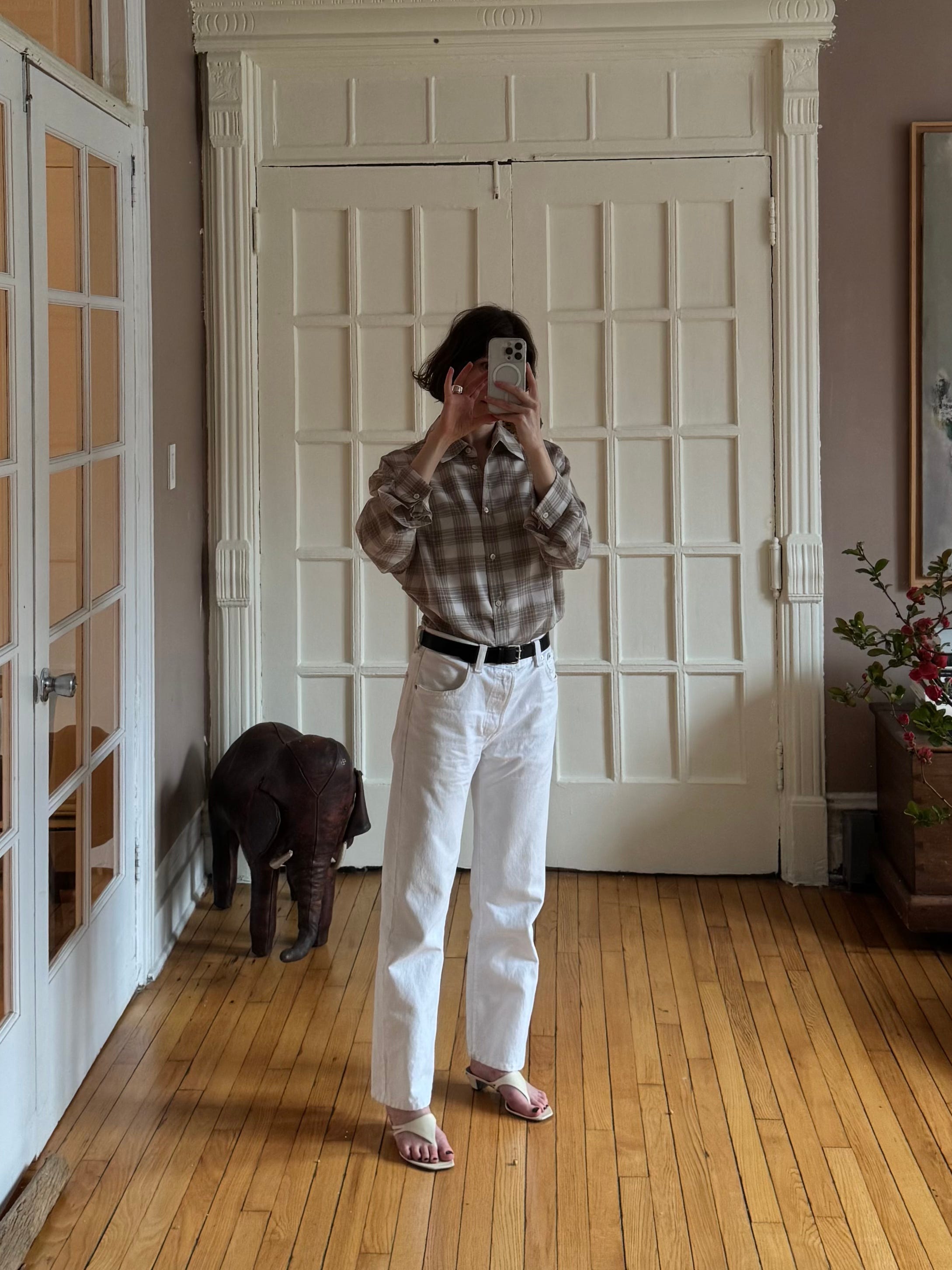 Kallmeyer Chloé Bib Button Down, $425 / vintage Levi’s 501s / Déhanche Mini Hutch Silver Belt, $190 / The Row Graphic Thong Lambskin Slides (pre-owned here, here, here, here, and here)