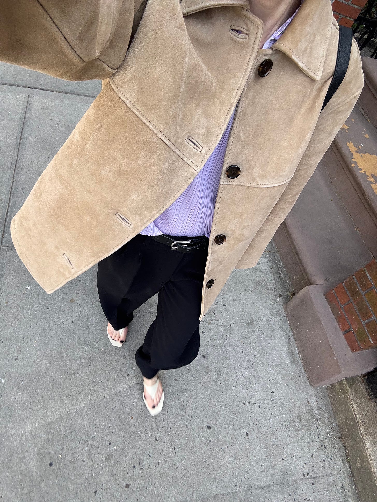 COS Collared Suede Jacket, $690 / Pleats Please Purple Monthly Colors April Polo, $287 $410 / Saint Classic Leather Belt Silver, $158 / The Row Graphic Thong Lambskin Slides (pre-owned here, here, here, here, and here)
