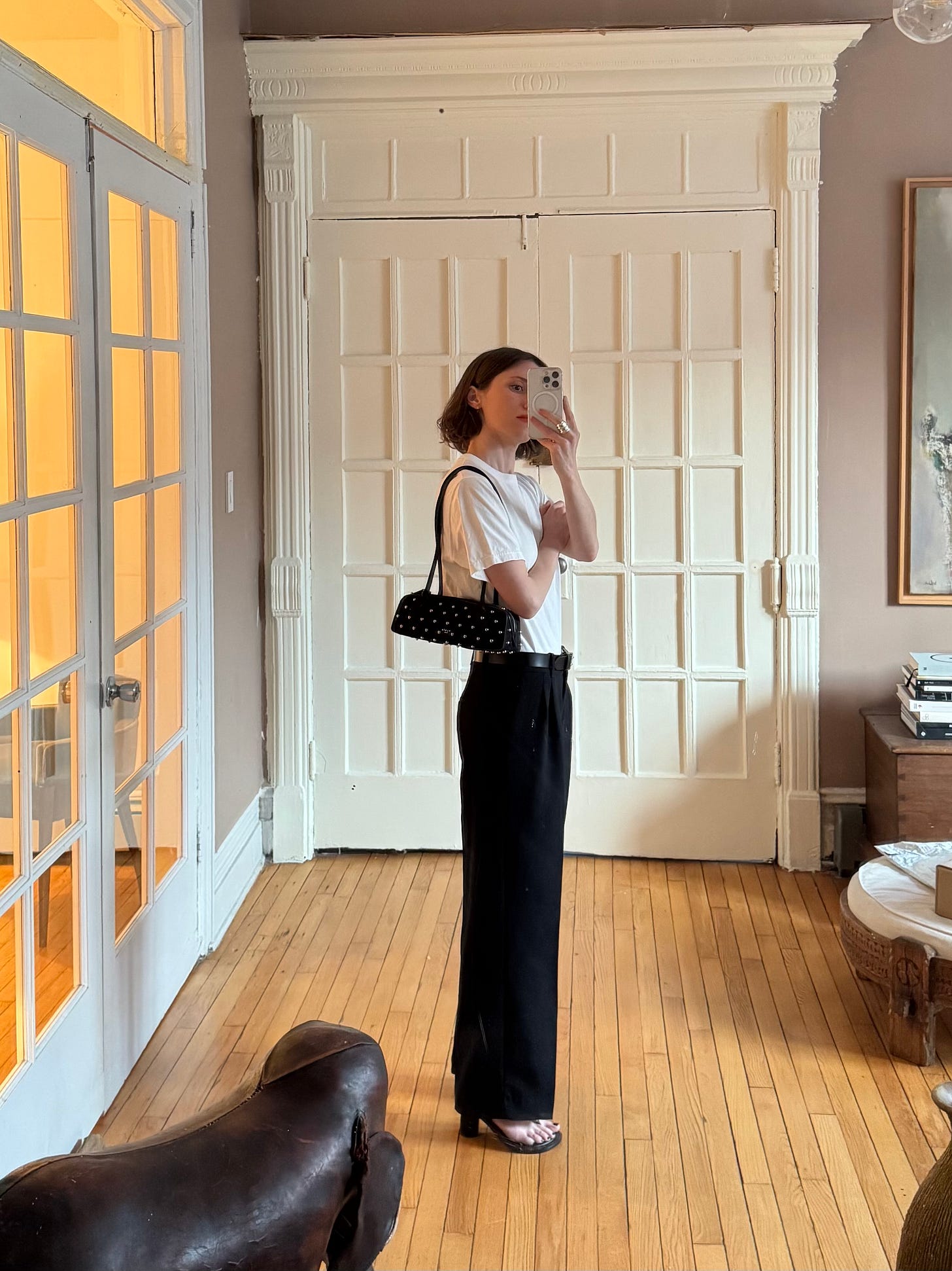 Uniqlo AIRism Cotton Oversized T-Shirt, $14 / Aritzia The Effortless Pant Lo-Rise, $148 / A.Emery Hardie Leather Thong Sandals, $250 / Déhanche Mini Hutch Silver Belt, $190 / Alaïa Studded Le Teckel Bag, $3,100