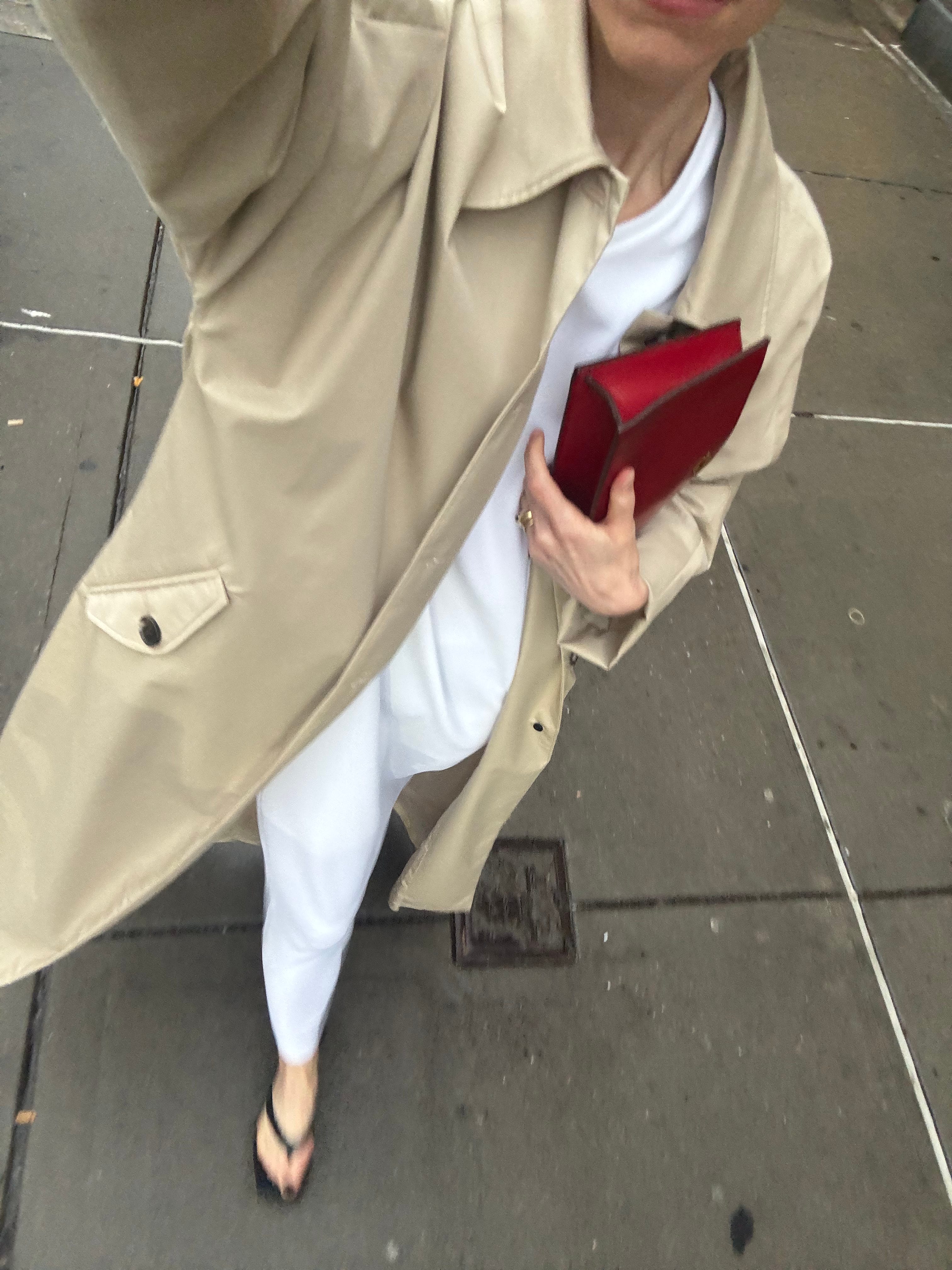 Kallmeyer Tavi Dinner Trench, $1,190 / Khaite Verda Jersey Maxi Dress, $880 / Métier Ease 20 Clutch, $1,950 / Magda Butrym x H&M Rose-Appliquéd Leather Sandals, $169
