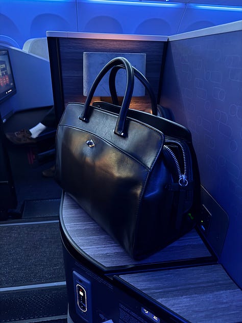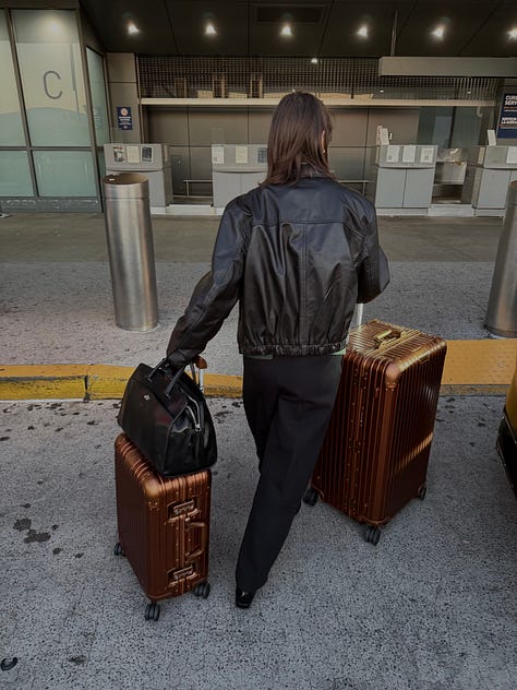 What’s in my bag? What is my bag? I upgraded my vintage, pre-LVMH Rimowa suitcase I got on The RealReal to a new bronze luggage set from the brand; a Trunk Plus and an Original Cabin. It’ll mark the first time I travel for fashion week and haven’t underpacked. It’s a relief having way too many shoes with me, I have to admit. As my personal item, I traded out my often-used Métier Cala 32 for a Métier Private Eye. Sitting atop the cabin case, well, it’s quite the sight. The Private Eye has a bit more room and additional compartments that make it even easier for plane travel. My inner pouch, this pebbled-leather Cuyana, got an edit, too. I’ve whittled down the contents to a Lunya eye mask, Noshinku hand sanitizer, Iris&Romeo peptide lip mask, Lemme magnesium and melatonin gummies, Eadem lip glosses, Buly mini comb and toothbrush, nasal saline spray, Lumify eyedrops, AirPod Pro 3s, Muji 0.25 gel pen, spare contact lenses, souvenir lighter from Capri, travel toothpaste. I want for nothing!