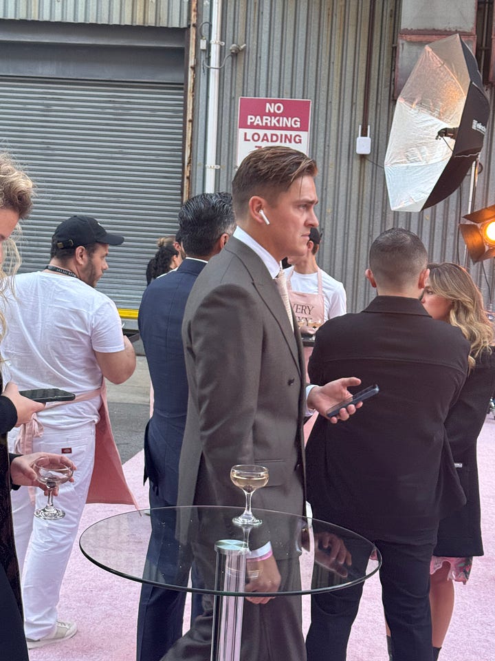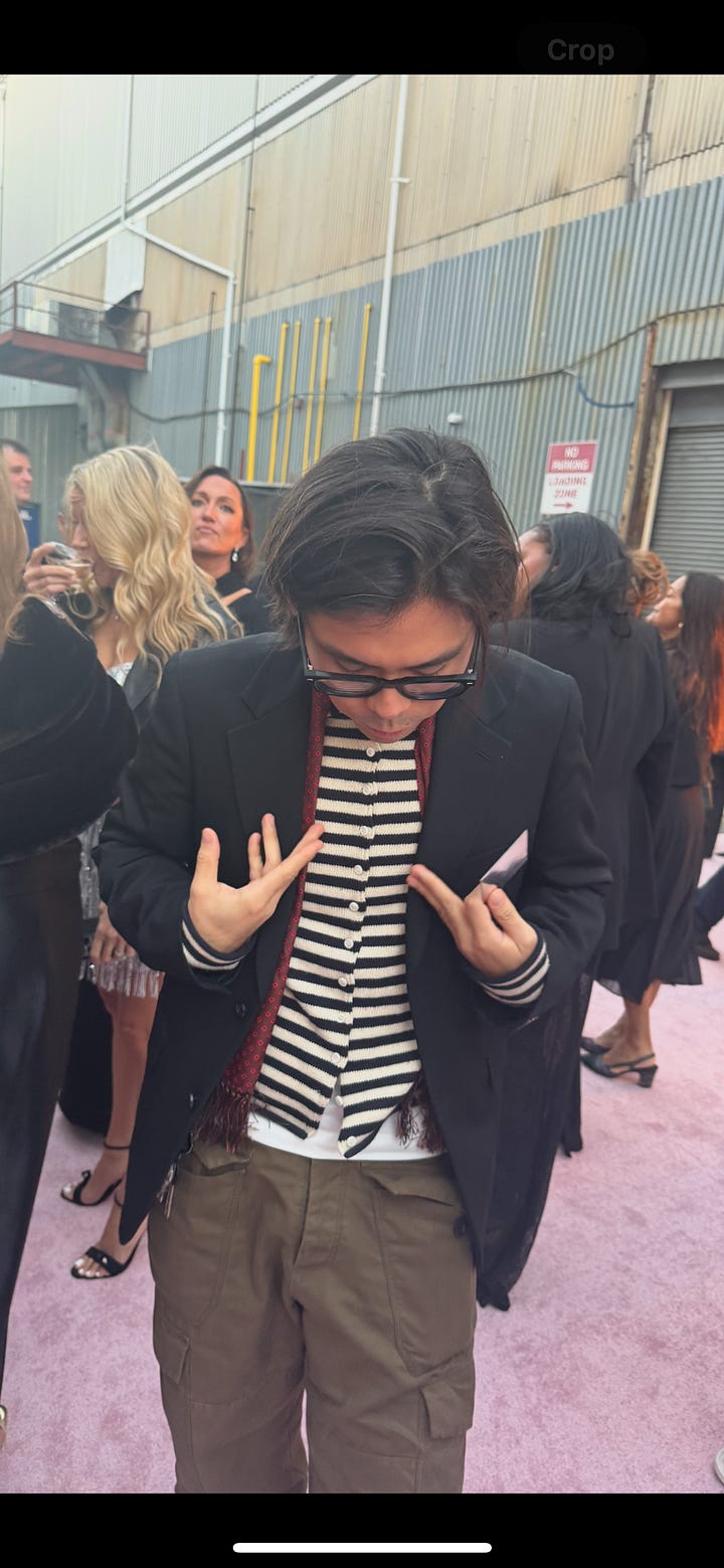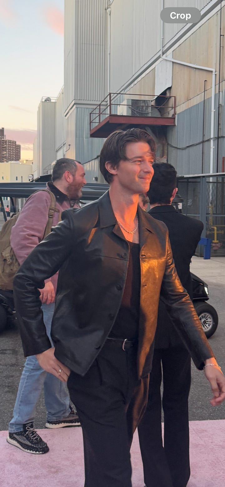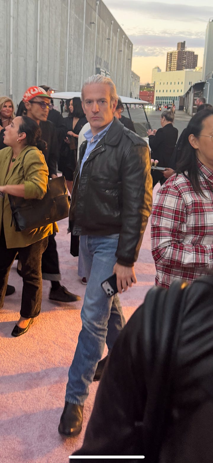 I saw four men in brown suede cropped jackets. This man is referencing the 2007 show when Justin Timberlake opened with sexy back in a full three-piece suit. Patrick Schwarzenegger walked past with a huge smile and what appears to me as unisex tailored blazer-like leather jacket—reminding me of this one from the spring 2025 Kallmeyer show. Locked eyes with the cutie Mel Ottenberg in his black leather bomber with rib trim. It felt like when I first moved to New York in 2012. Everyone was in New York blacks. Including myself.