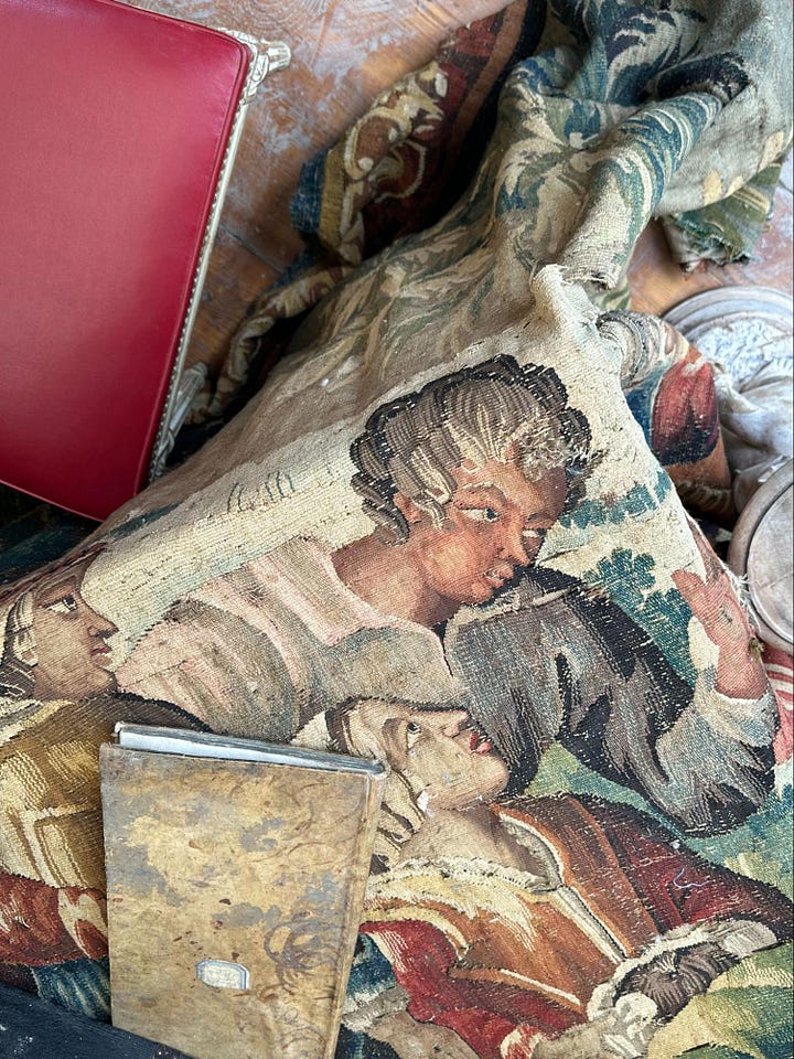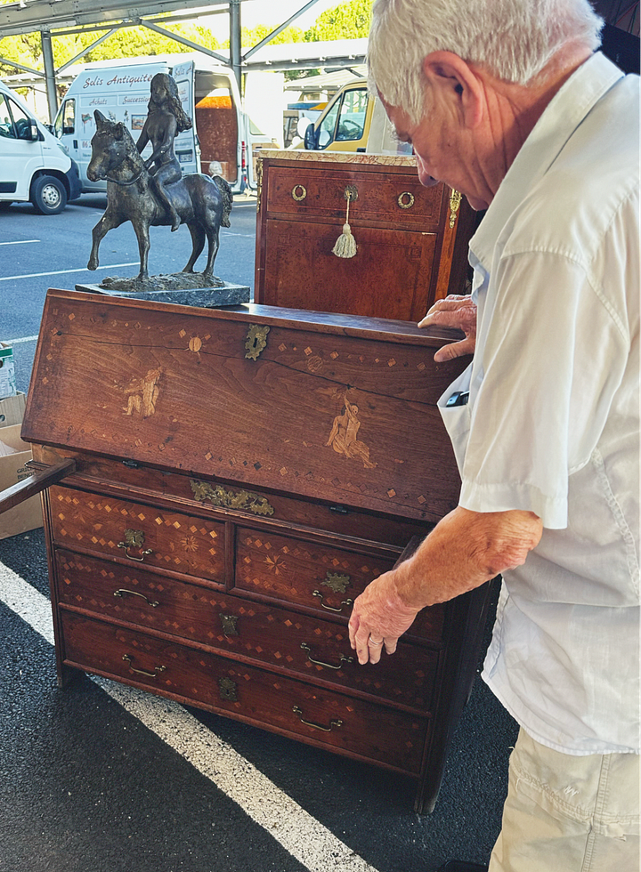 On to the fun part. I cannot overstate the scale, diversity, and quality of what you’ll find at these fairs, not to mention the deals you’ll get on items that would otherwise cost a small fortune, especially if you’re willing to undergo a little refurbishment. On a damp autumn morning at the Foire de Chatou, we scored an incredible wood and tortoiseshell inlaid Antwerp Cabinet for next to nothing because it had a slightly damaged leg (these typically command very high prices), a large painted theater backdrop (like this one), and just for fun, a full set of 12 Limoges dessert plates, each hand painted with a unique dessert motif (I can’t find these online, but they remind me of the trompe l’oeil plates by Gohar World).
