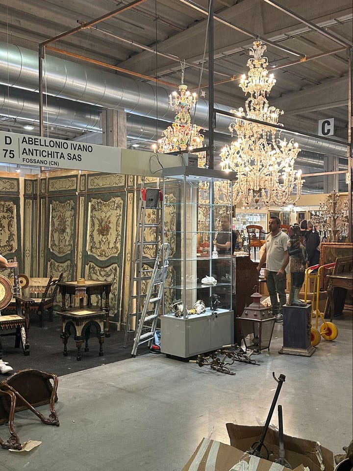 Navigating the seemingly endless stalls of the Mercanteinfiera in Parma, we bought Aubusson tapestry chair cushions and yards of 19th century French silk (a great resource for vintage fabric is The Textile Trunk on Etsy). I discovered a new obsession in vintage gentlemen's wardrobes, kitted out with all kinds of clever storage and practical grooming fixtures (there are plenty of these available online here, here, and here are a few nice ones). The Parma fair also stocks 10-foot Murano chandeliers, carved wood spiral staircases, and entire rooms salvaged from ancient stately homes, if you’re in the market for any of that.