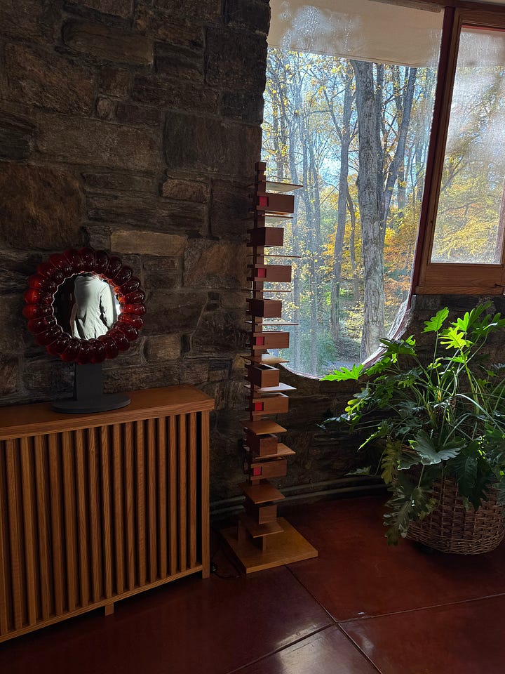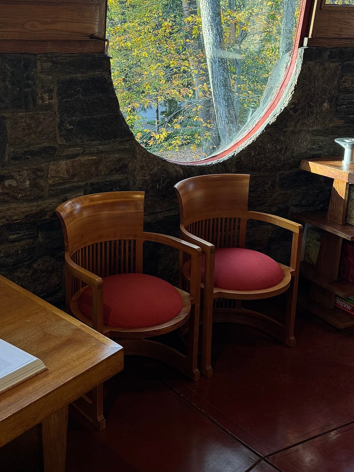 ’s Surroundings to a privately owned Frank Lloyd Wright residence about 45 minutes out of the city. The house is so FLW from the architecture to the furniture that the current owner relayed to us the advice he got upon purchasing it: “Don’t bring anything but a toothbrush.”The owner did introduce a few pieces to the funky, hexadecagonal cabin, but of course they were very on-brand: a pair of Taliesin Chairs by Frank Lloyd Wright for Cassina, a Taliesin Floor Lamp 2, and some Barrel dining chairs, apparently because the original built-in dining setup exclusively provided backless stools.