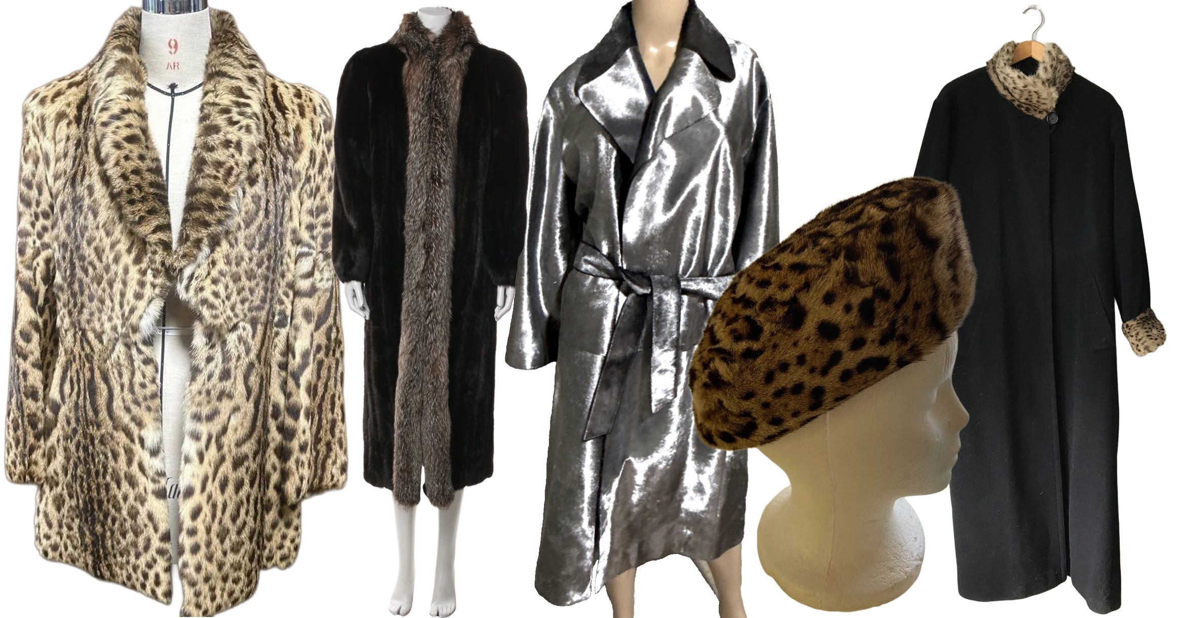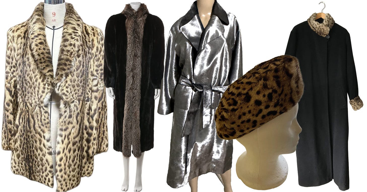 Leopard Fur Coat with Pockets, $298 / Mink Printed Fur Coat, $715 $795 / Giorgio Armani Runway Silver Fur Leather Belted Jacket Trench Coat, $2,690 $2,995 / Antique Leopard Fur Hat, $299 / Black & Leopard Fur Fleurette Coat, $200