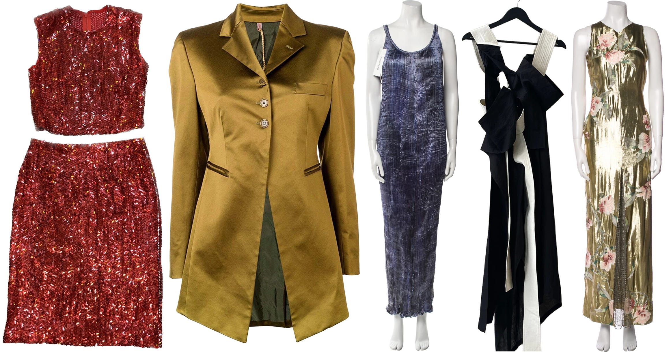 Vintage 1999 Comme Des Garçon Runway Archival Two Piece Red Sequin Top And Skirt, $650 / Vintage Finds 1980s Romeo Gigli Olive Blazer, $648 / Charles & Patricia Lester Vintage Long Dress w/ Tags, $822 $1,175 / Yohji Yamamoto White Karate Belt Dress, $1,036 / Valentino Vintage Long Dress, $2,295