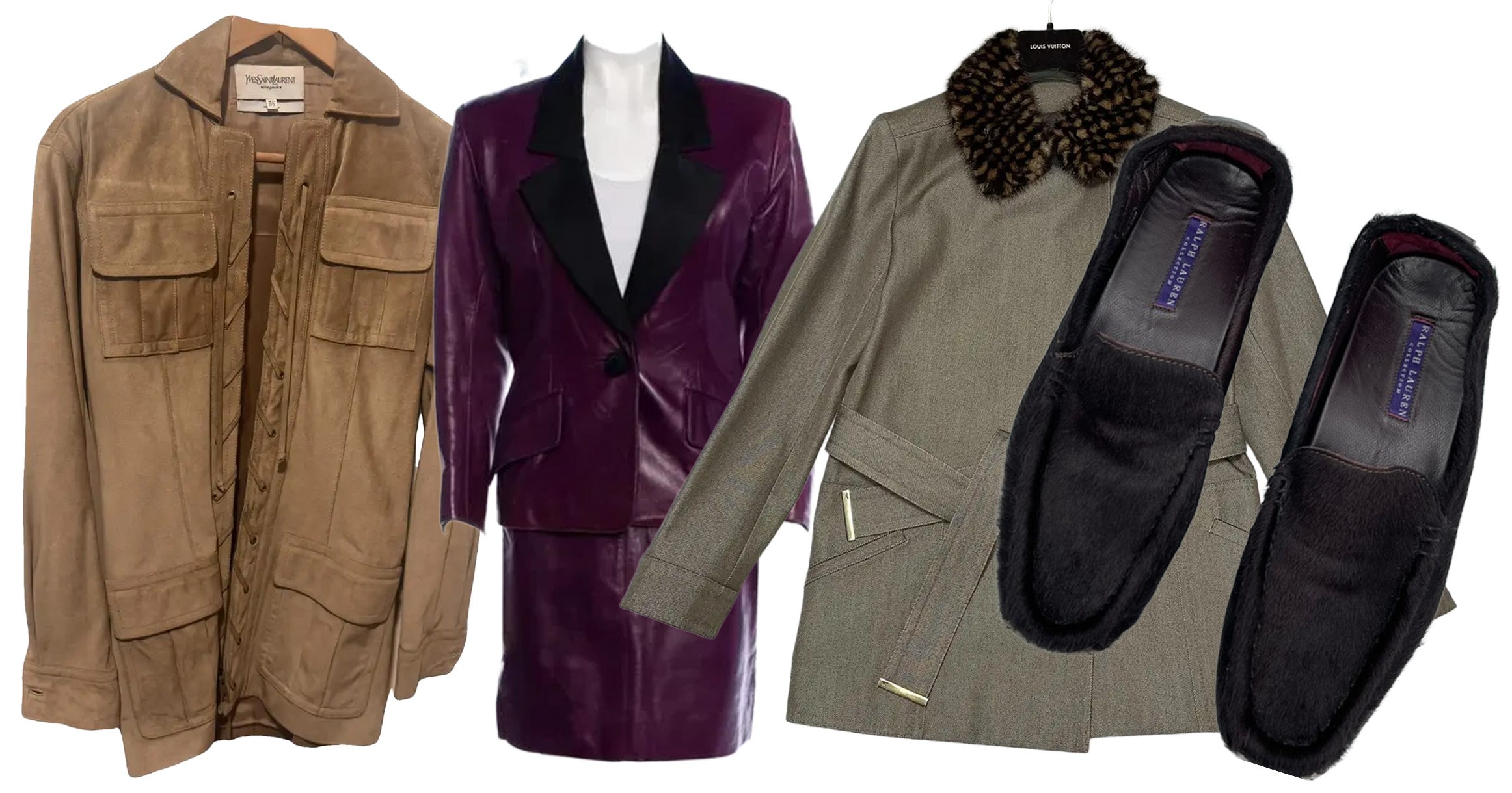 Yves Saint Laurent Leather Jacket, $1,366 $1,670 / Yves Saint Laurent 1990s Plum Leather and Satin Blazer Jacket and Skirt Set, $698 $3,400 / Louis Vuitton Mink Collar Damier Belt Denim Jacket, $707 $1,000 / Ralph Lauren Collection Calf Hair Loafers, $78 $600