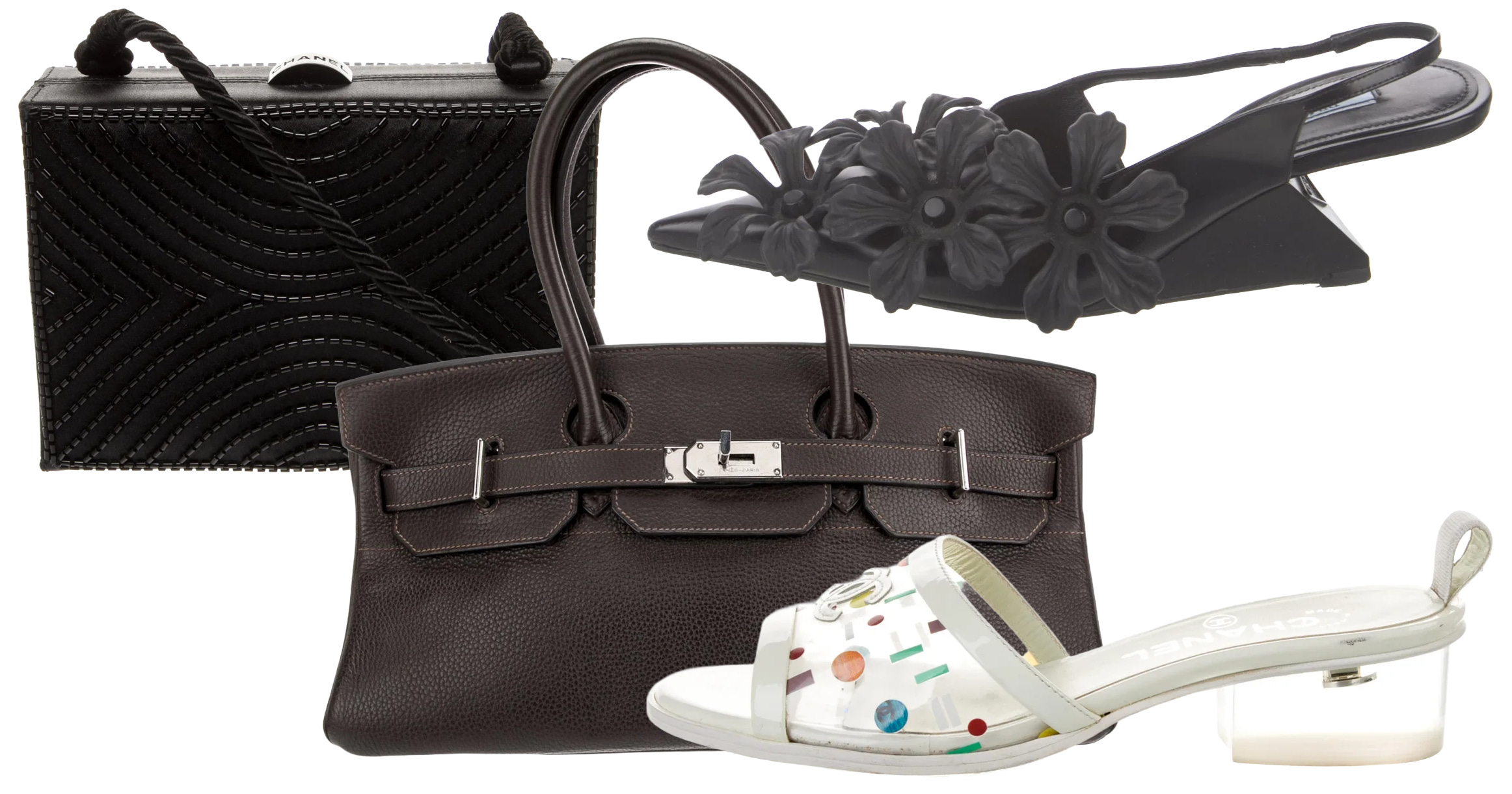 Chanel Satin Beaded Evening Bag, $783 $1,045 / Hermès Togo JPG Shoulder Birkin 42, $12,600 $18,000 / Prada Leather Slingback Pumps, $357 $510 / Chanel Interlocking CC Logo PVC Slides, $437 $625
