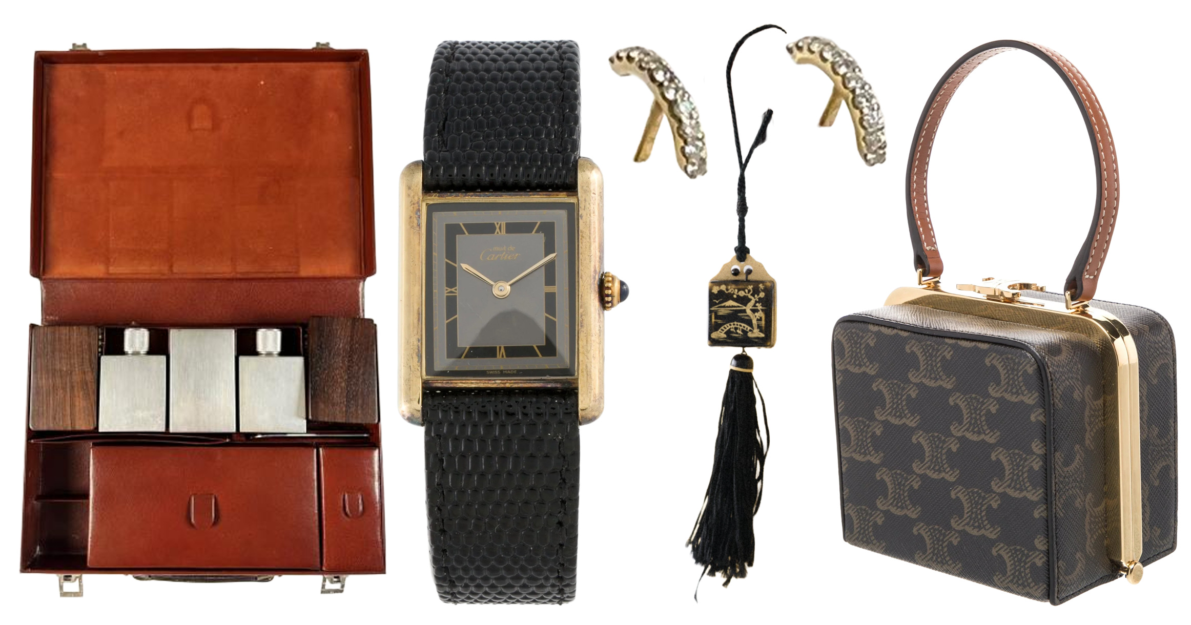 Hermès Toiletry Leather Travel Case Circa 1970, $1,600 / Cartier Must Tank Watch, $2,250 $2,500 / Ana Khouri Norah Stud Earrings, $1,250 / Desert Vintage Antique Compact Purse, $998 / Celine Monogram Triomphe Canvas Vanity Box Mini 2022, $1,295
