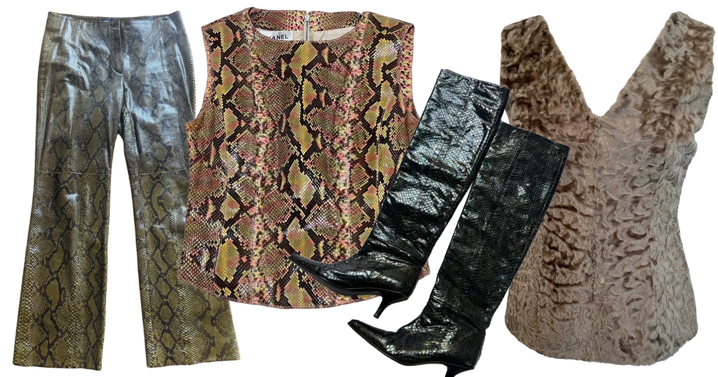 Luxury Santacroce Real Python Leather Skin Pants, $650 / Chanel Python Sleeveless Top, $347 $366 / Tom Ford for Gucci 1997 Deep Green Knee High Python Boots, $720 $1,700 / Dolce & Gabbana F/W 1998 Runway Genuine Astrakhan Lamb Shearling Sleeveless Top, $900
