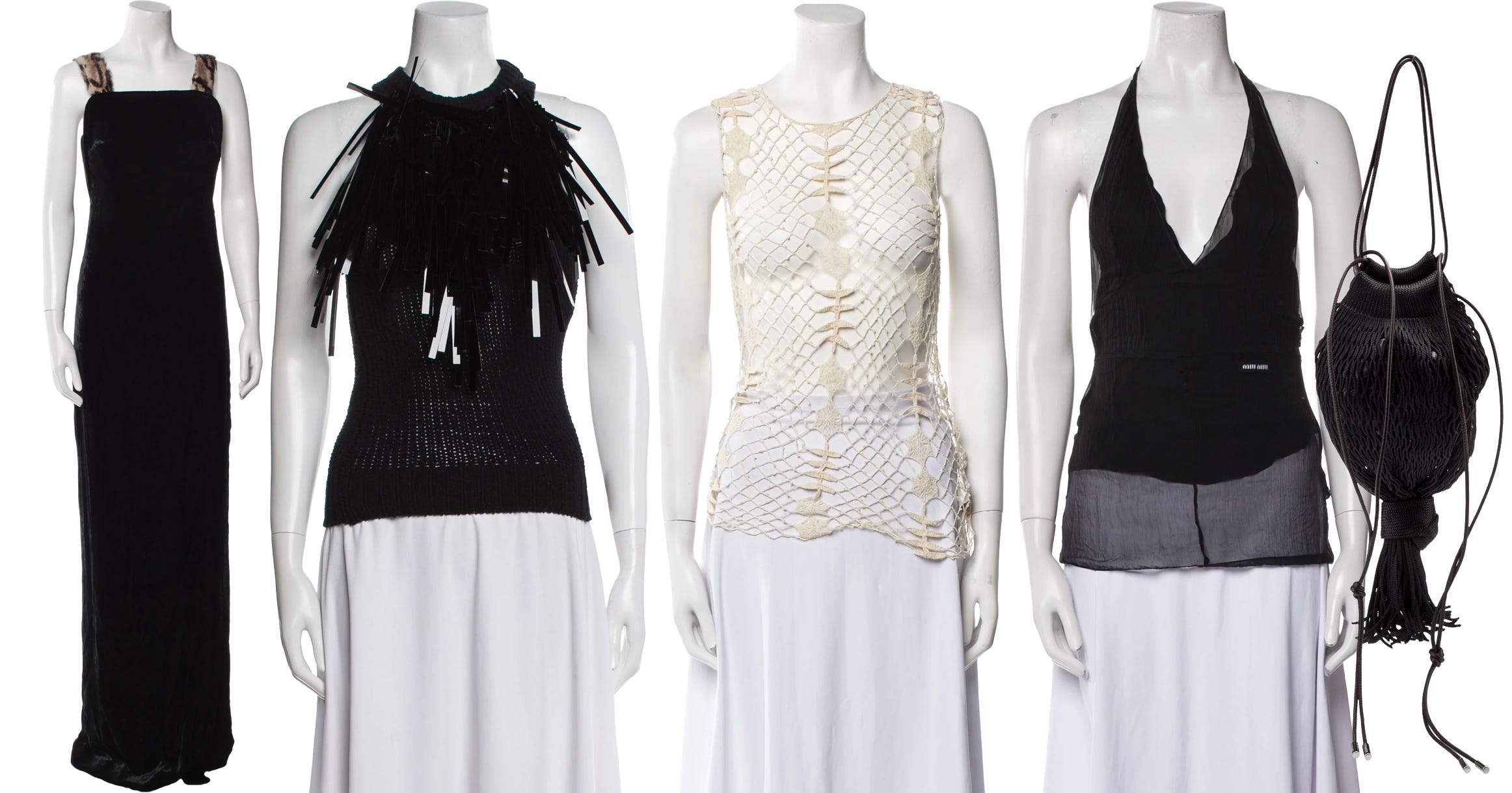 Tom Ford Square Neckline Long Dress, $350 / Jil Sander Mock Neck Sleeveless Top w/ Tags, $526 $585 / Yohji Yamamoto Vintage 2003 Top, $382 $425 / Miu Miu 2023 Silk Top, $700 $875 / Lemaire Evening Bag, $266 $410