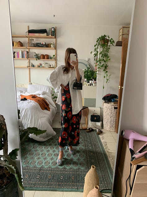 My first pair of MNZ shoes were these split-color patent ankle boots (one half pink, one half black) that I’d bought on Noihsaf Bazaar. I’ve owned 3 or 4 pairs of Olympias, most of which I bought at the sample sales. Strappy baby blue Maribel sandals. Knock-offs of the pink patent Sophie slides lol. A pair of mermaid wedges were my most treasured possession, worn impractically deep into winter year over year and so often I didn’t even want to stop wearing them long enough for a cobbler to fix the quickly diminishing heel. Countless others. One of my favorite looks (that I never bought—Haley Wollens wore it on the runway, and Jo Rosenthal had it I believe, I was so jealous) was a check wool three-piece consisting of a bralette and pencil skirt worn over slacks. I think about contrast-sleeve prairie dress often.