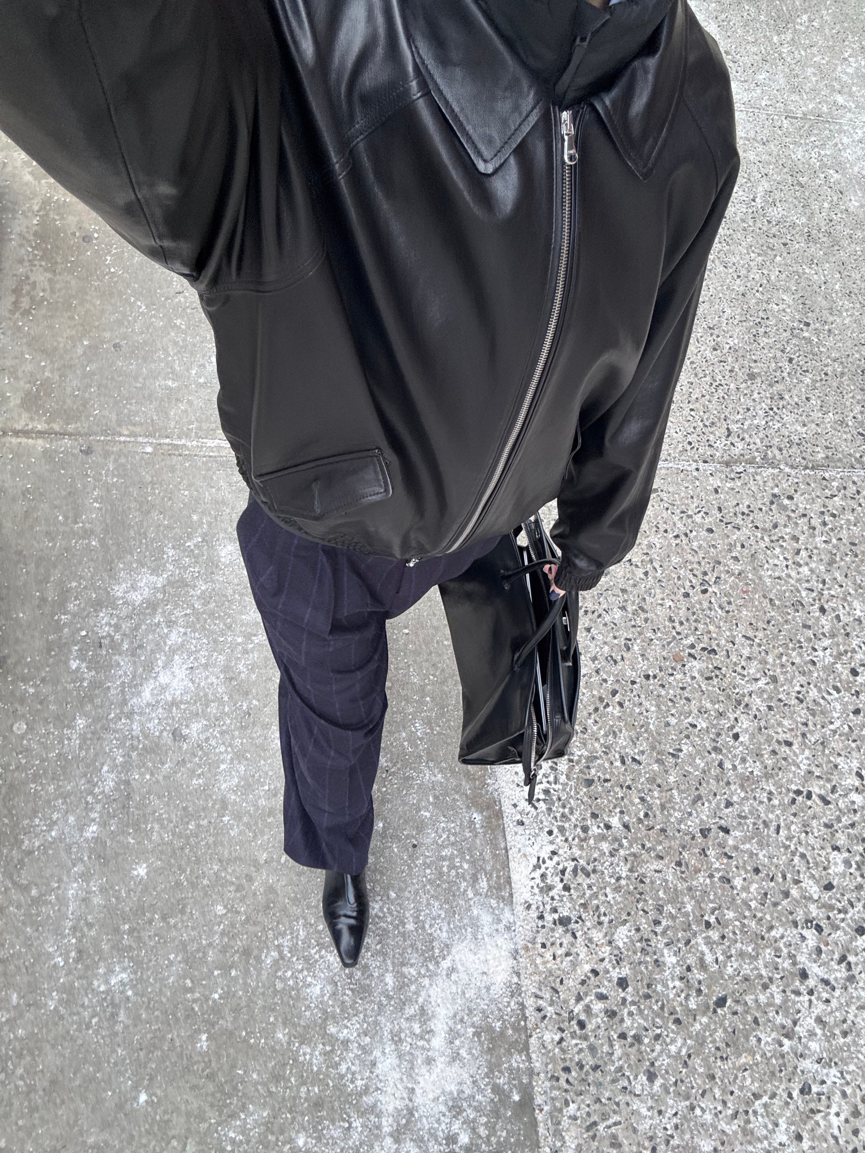 I’ve worn it quasi-formulaically, with an oversized leather jacket (this one from Lexx Finger Marche, with Cawley’s Flying Jacket, and Arma’s pinch-waist version), loose pleated trousers (Cristaseya cashmere pinstriped ones—very ‘80s corporate, The Row Lilas Pants), and what one could call a “briefcase” (either my The Row Marlo 12 or Métier Private Eye, which can carry a lot).