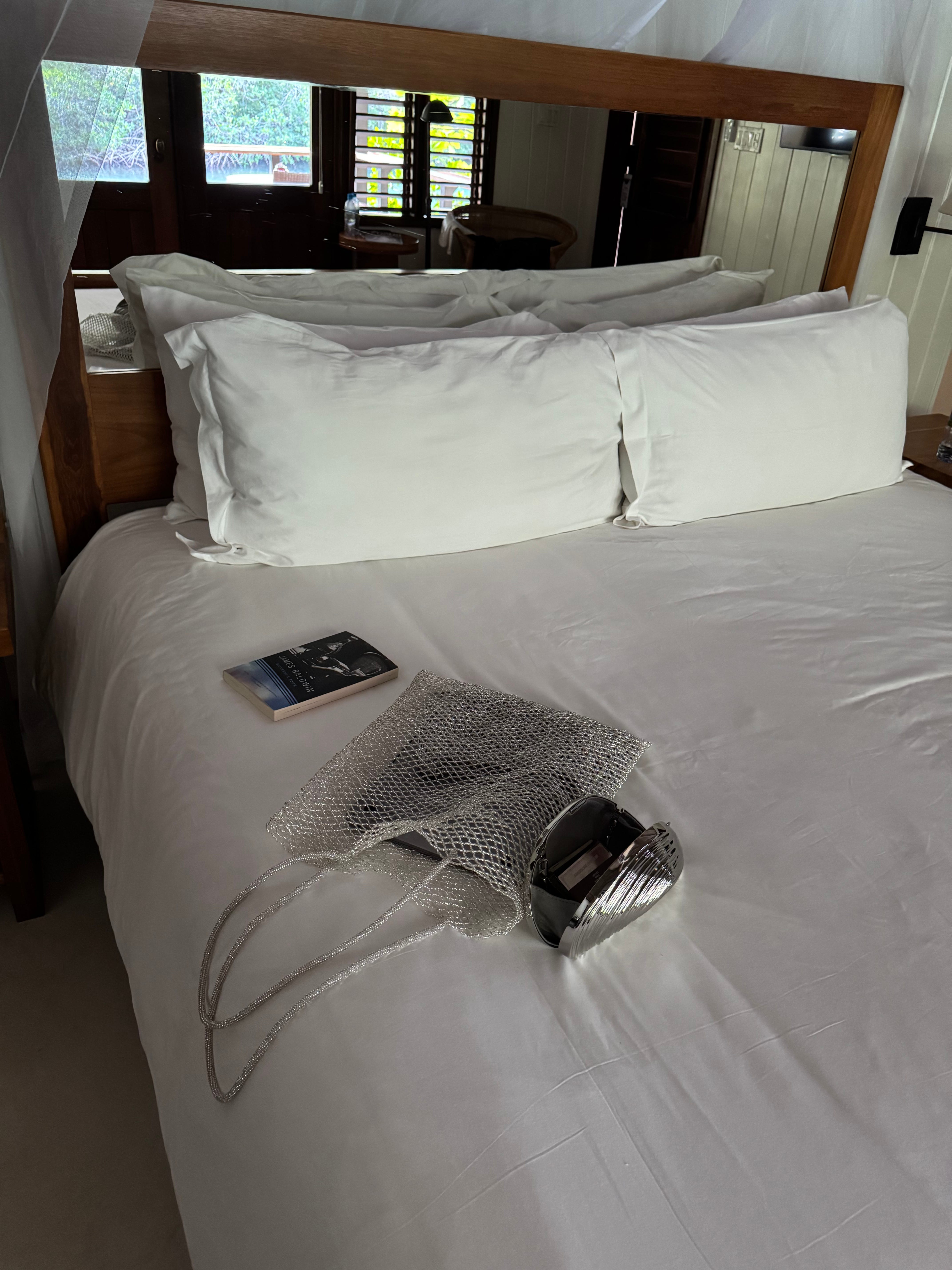 Still, one does wear clothes when traveling. This trip I had a hard time filling a carryon, packing for a tropical albeit pretty private trip where I don’t plan to see many people or have many people see me. Comfortable separates during the day: Co cashmere pants for the flight in and for open-air breakfast, H-O-R-S-E Sport shorts to throw over a bathing suit and quick-dry on the terrace, Saint’s new Resort Shirt as both bikini layer and elegant evening topper. There is no expectation to be dressed up here, none of Capri’s “wear every expensive piece of jewelry you own.” I am still me at night, though, and I’m wearing my favorite Silk Laundry 1996 slip dress, differentiated with silver accessories (Khaite’s Lotus Pendant, a Simkhai conch minaudiere), or a Dries Van Noten scarf skirt with a slinky dinky Fforme top and Blahnik strappy python sandals. In the water, only things that attach to me: my oft-worn Ring Concierge mariner necklace, Dorsey chain bracelet, and a tennis bracelet from Kimai’s collaboration with Juliana Salazar I’m wearing as an anklet.