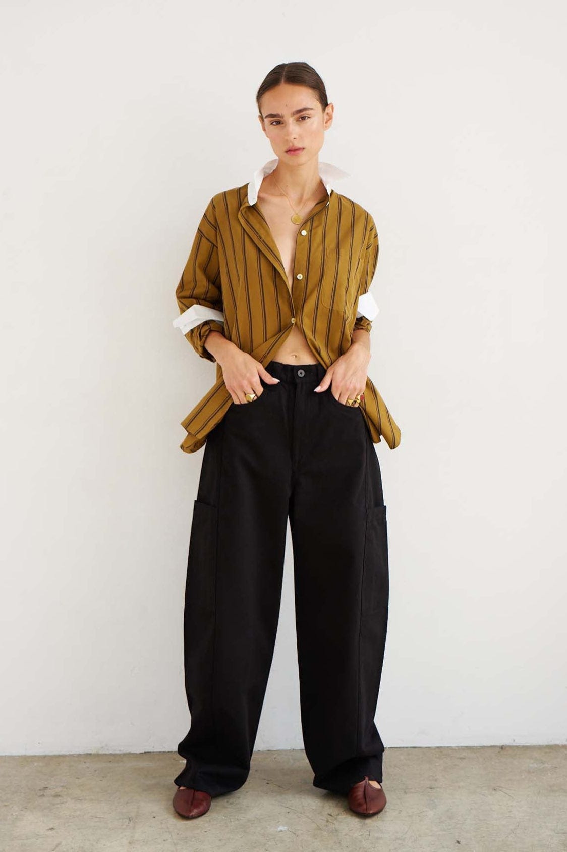 Posse’s exclusive capsule for Moda Operandi treats co-ords as a means for worldbuilding; not unlike filmmakers—we’re in awards season, it’s top of mind. The Polly set, a more muted multi-color striped cotton long-sleeve tee and shorts, can read both as a power-clash Jackie O or an early-aughts Beth Ditto, depending entirely on styling nerve.