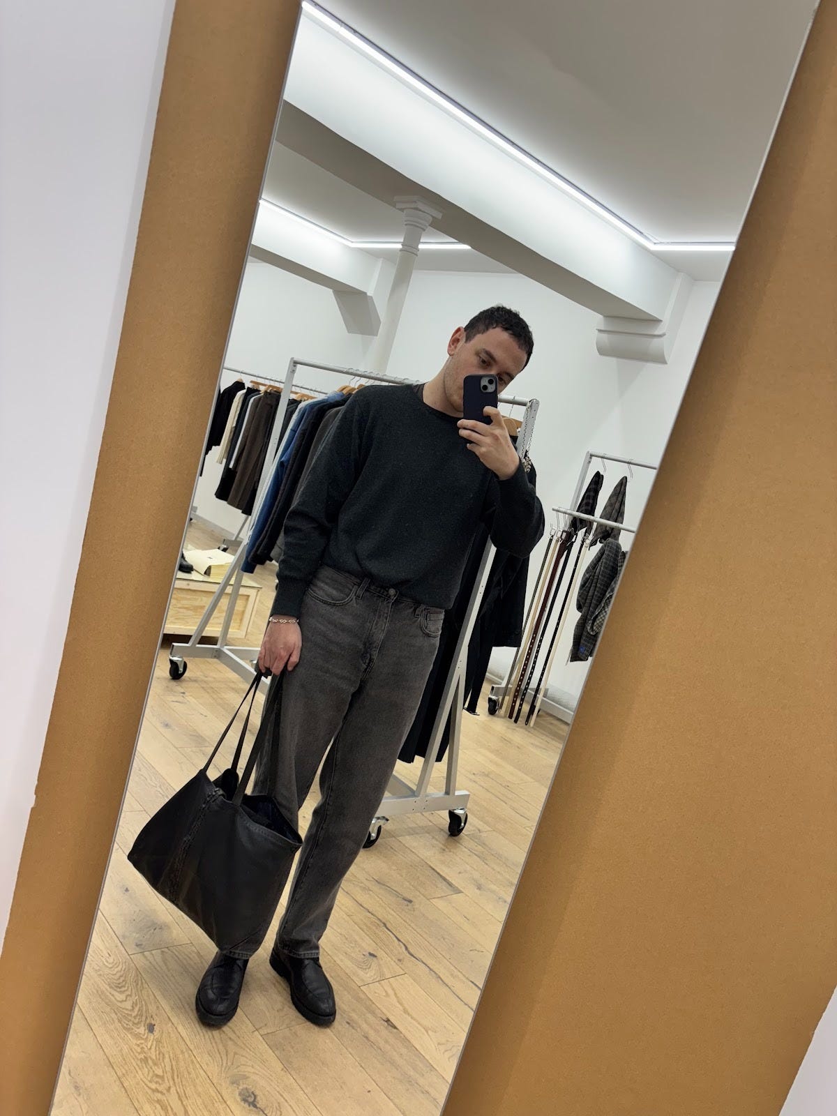 Lady White Co. Dri-Lite T-Shirt, Grindle, $70 / second-hand cashmere sweater, label says ‘House of Cashmere’ (going on a decade of wear!) / Levi’s 568, $110 / Le Majordome shoes, $620 / Mazarin Socks, $28 / vintage Henri Cuir leather bag / All Blues S bracelet, $570