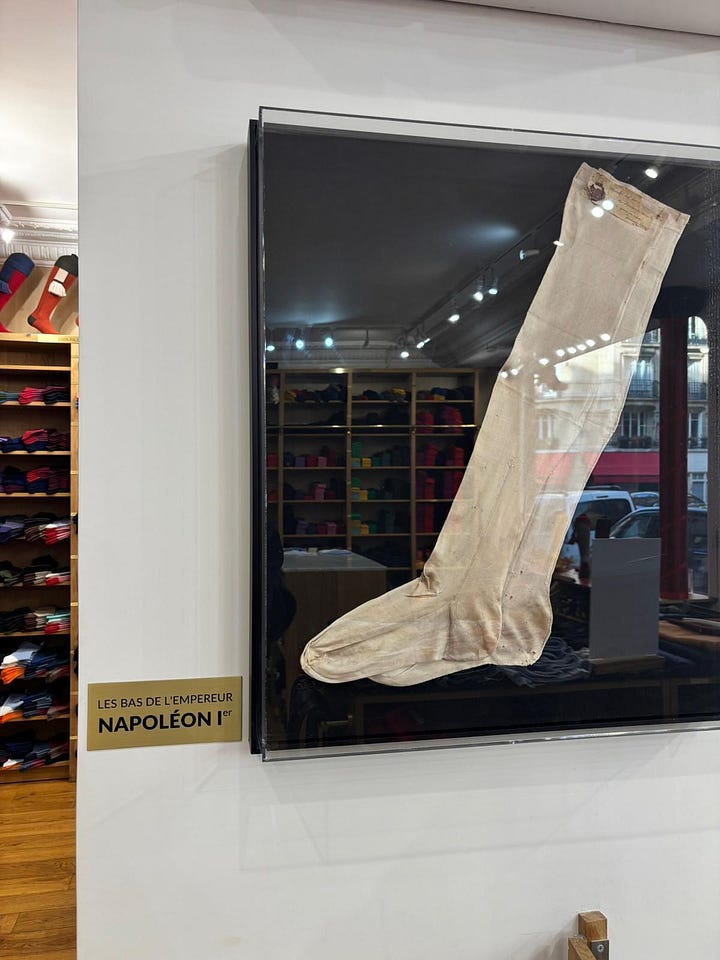 And speaking of loafers, at Mes Chaussettes Rouges—a store devoted to socks, with shelves for every shoe size—I learned that loafers create holes in socks faster than any other shoe, because your heel rubs more when your foot isn’t laced into place. More about that store: I took a half hour train to get there on a gut feeling, and was amply rewarded—took home two Mazarin pairs, a wool and a cotton, and some sparkly Brescianis. I also got to be in the same room as a pair of Gammarelli baby socks (the Pope’s supplier) and a pair worn by Napoleon I (An auction bid win which, the owner joked, the business is still recovering from).