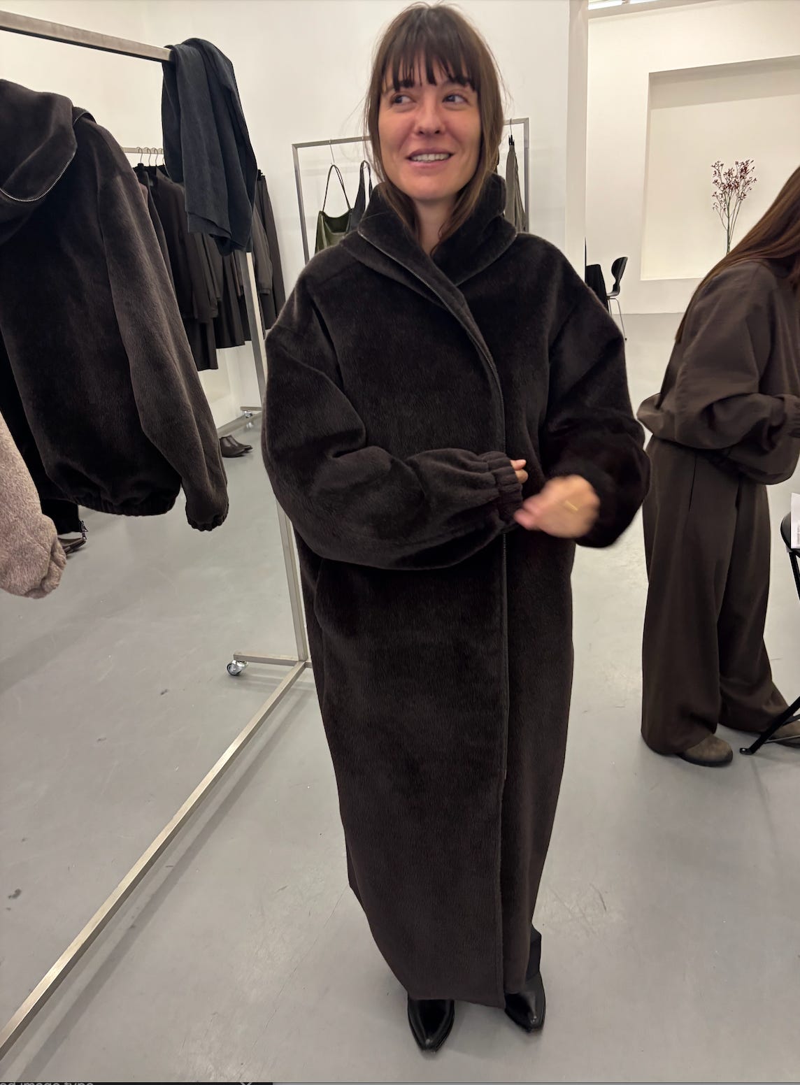 Gabriela Coll has made a swaddling floor-length hooded suri alpaca coat (above), and I am coveting the upcoming waist-length version, which I insisted on wearing for most of my hang with her.