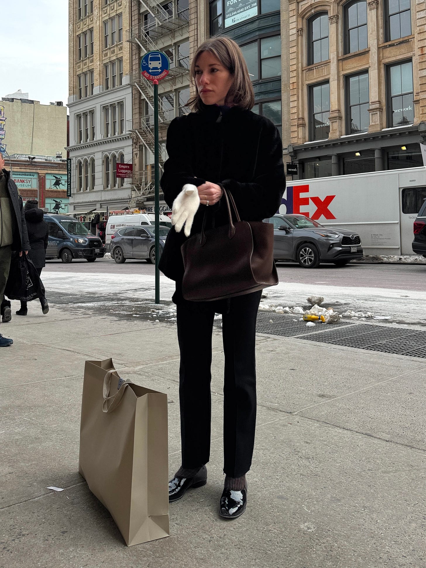 Nour Hammour Elsa Merinos Ladylike Shearling Coat, $2,120 / Apiece Apart Rene Pull On Pant, $495 / The Row Marlo 12 Bag, $3,400 / Chanel Patent Leather Flats (on resale, $3,361, similar from Ezra Flats, $345) / Comme Si The Cashmere Glove, Short, $150
