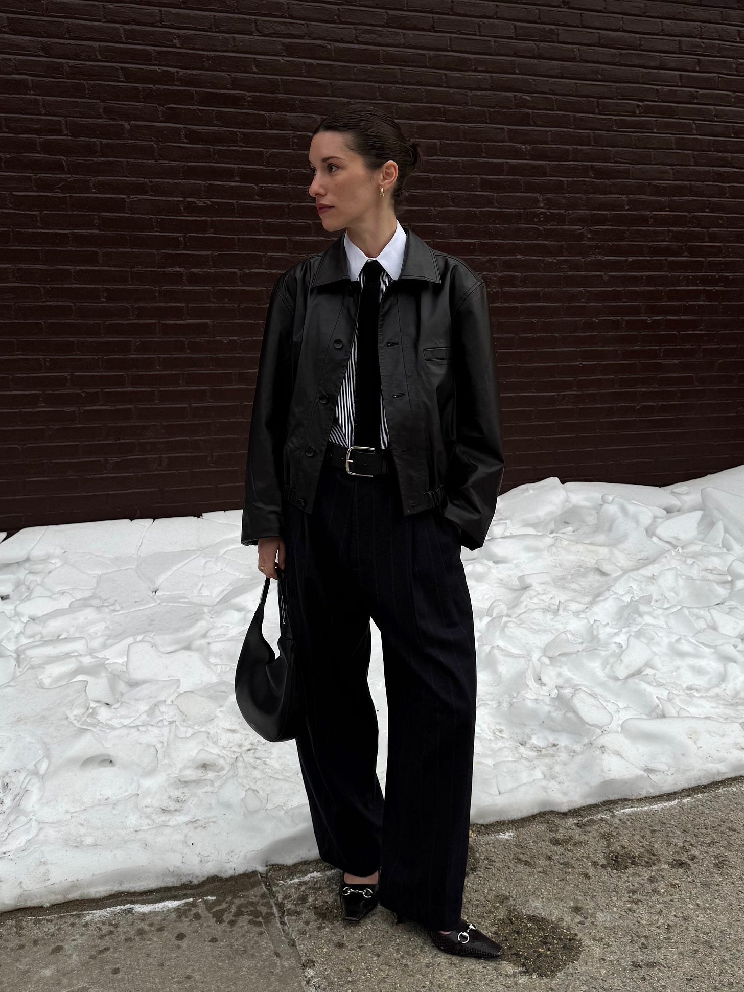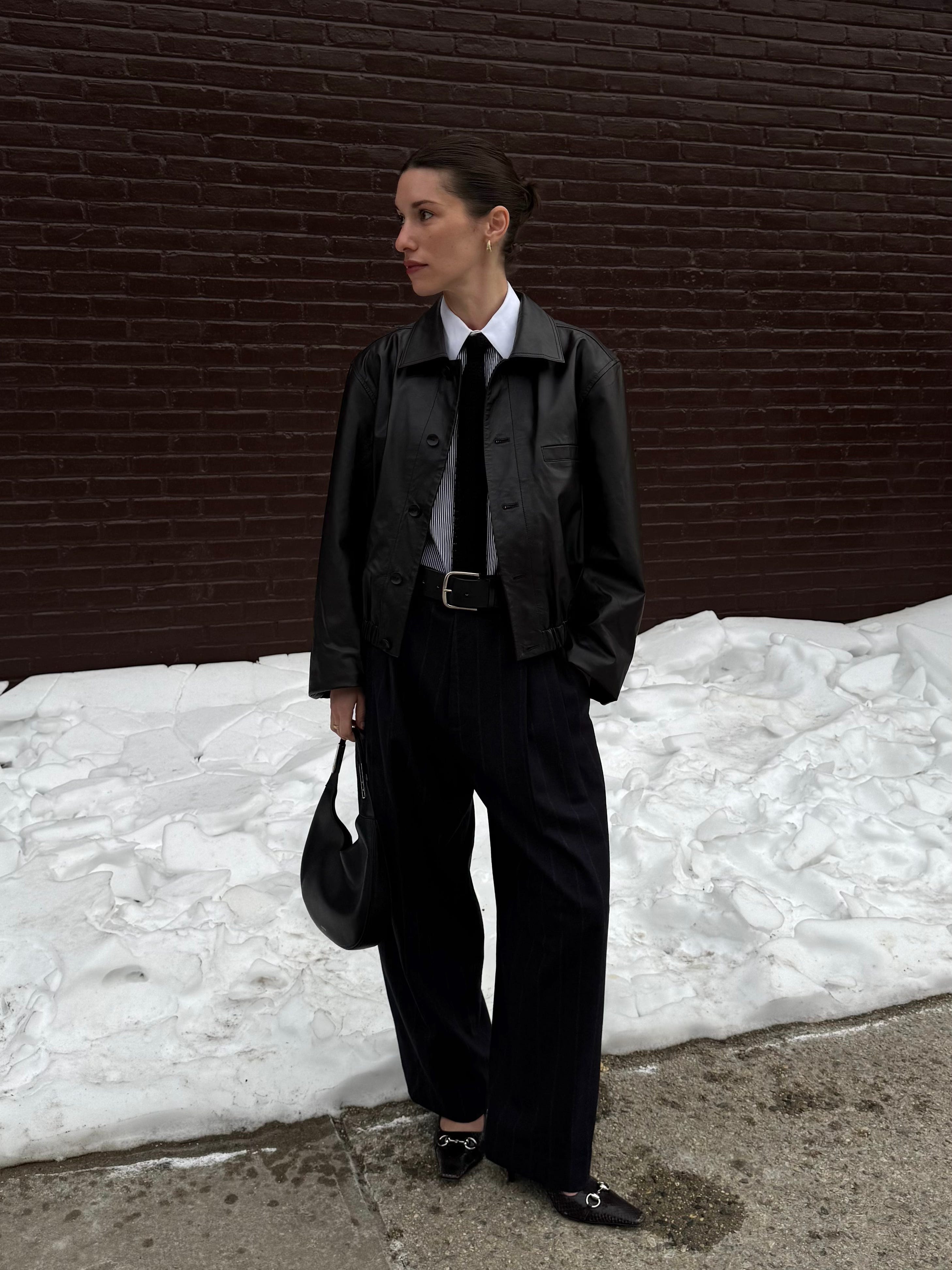 Lemaire Brown Soft Leather Jacket, $2,096 $2,620 / Celine Striped Long Sleeve Button-Up Top (on resale, $103) / Polo Ralph Lauren Knit Silk Tie, $95 / Cristaseya Double Pleated Wide Pants, $1,017 / Savette Small Florence Hobo, $1,490 / Gucci Vittoria Python Pump, $1,600 / Maximum Henry Wide Standard Belt, $160