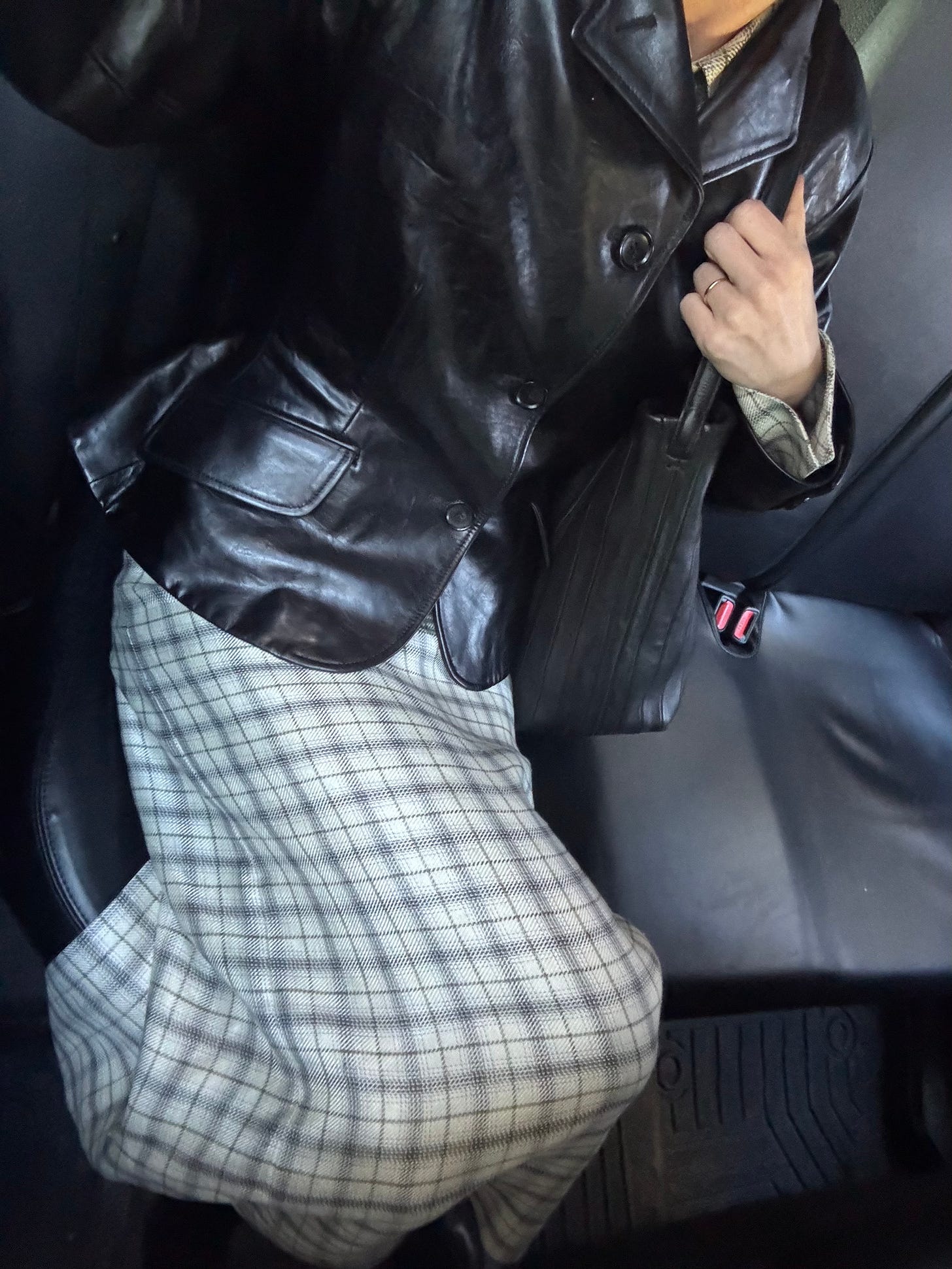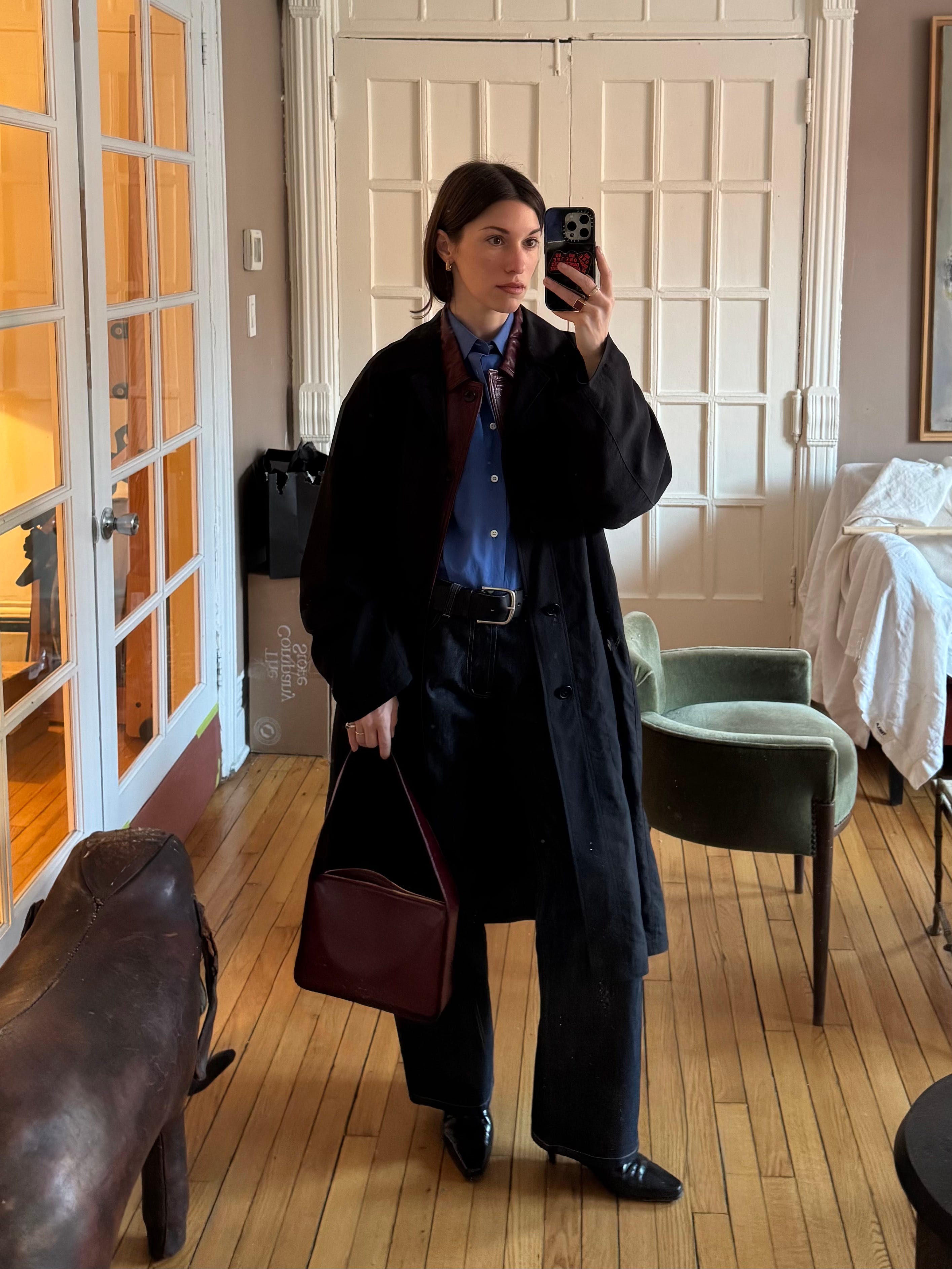 Uniqlo U Men’s Car Coat (on resale, $121) / Keigan Burgundy Leather Jacket (similar from Atorie, $325) / Rubirosa Button-Down Shirt, $340 (similar from Comme Si, $275) / Olga Basha Sal Jeans, $490 / Khaite Lori Squared Bag, $1,980 / Toteme The Slim Leather Knee-High-Boots, $791 $1,130 / Maximum Henry Wide Standard Belt, $160