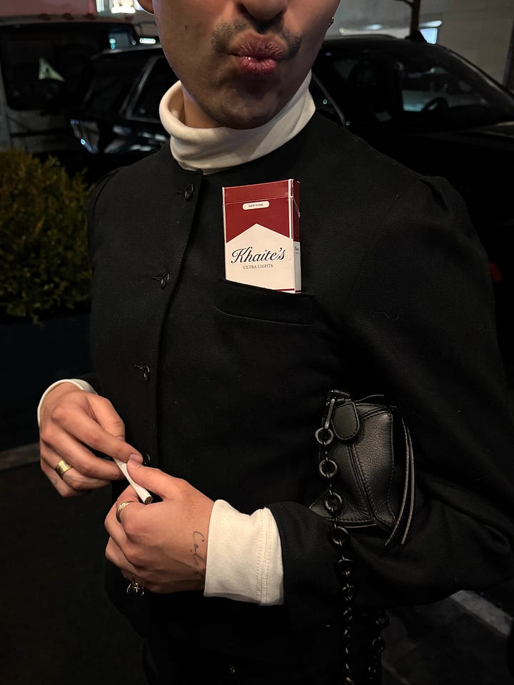 Most Americans don’t anymore, but fashion people still smoke cigarettes. They were everywhere this week: GWYN, Khaite, I saw beauty brand (!) Sidia released its own…less compelling…custom branded cigarette packs. Madewell offered them last season for it’s Alexa Chung collab party, too. I have to wonder why? The “suppresses appetite” argument is less convincing with GLP-1s available, so I imagine it’s because smoking is nostalgic (I’m watching “Mad Men” and am physically overwhelmed thinking about how much people used to burn through cigs). Everyone still wants to have been a guest at Mary-Kate’s wedding. I also have to say this because I get comments for every smoking mention: I am not advocating for it! It’s not my business what other people do with their bodies.