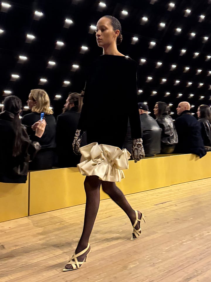 A ruffled Khaite dress from the runway reminded me of a pair of Hai pants I have at home—crushed velvet with rows of dupion silk frills at the hem. Inspired to wear them now with a bowtie, possibly as a belt.