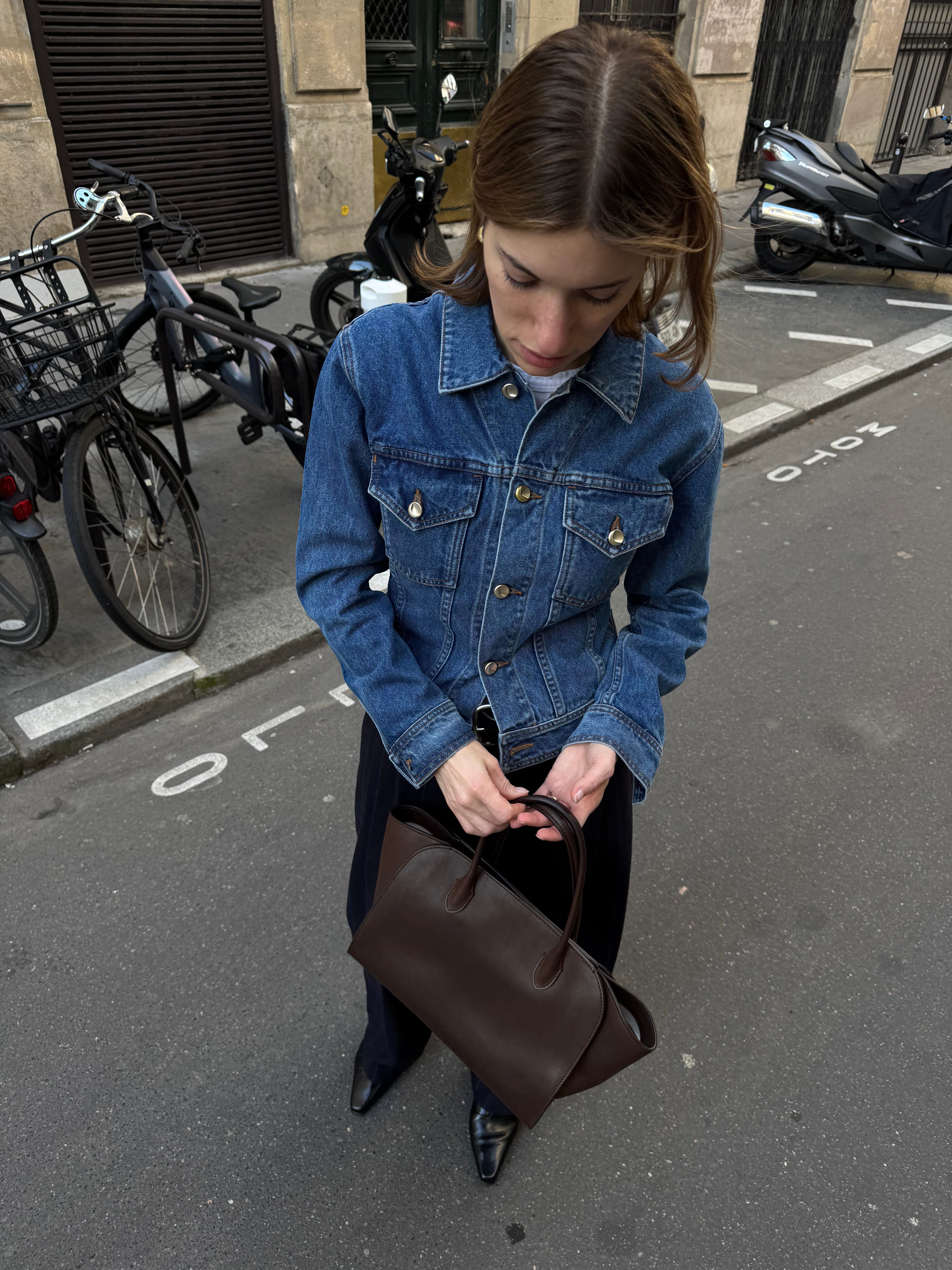 Ossou Hitch Jacket in Horizon Wash, $695 / Leset The Margo Tee, $78 / Cristaseya Double Pleated Wide Trousers, $1,017 / The Row Marlo 12 Bag, $4,900 / Toteme The Slim Boots, $791 $1,130