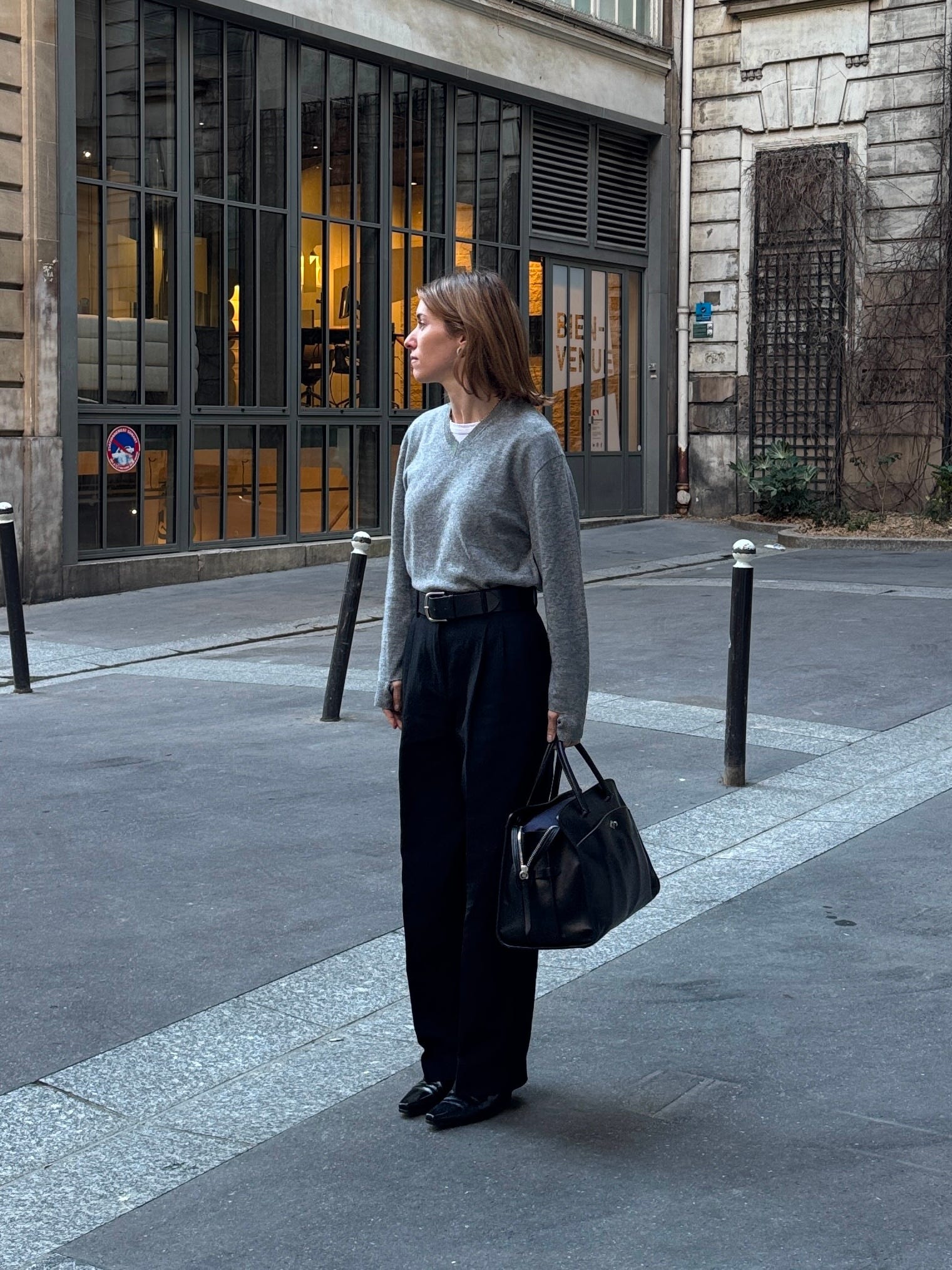 Tibi Washable Cashmere Easy V-Neck Sweater, $565 / Leset The Margo Tee, $78 / The Row Lilas Trousers, $870 $1,450 / Métier Private Eye Leather Tote, $5,250 / Toteme The Slim Boots, $791 $1,130 / Maximum Henry Standard Wide Belt, $160